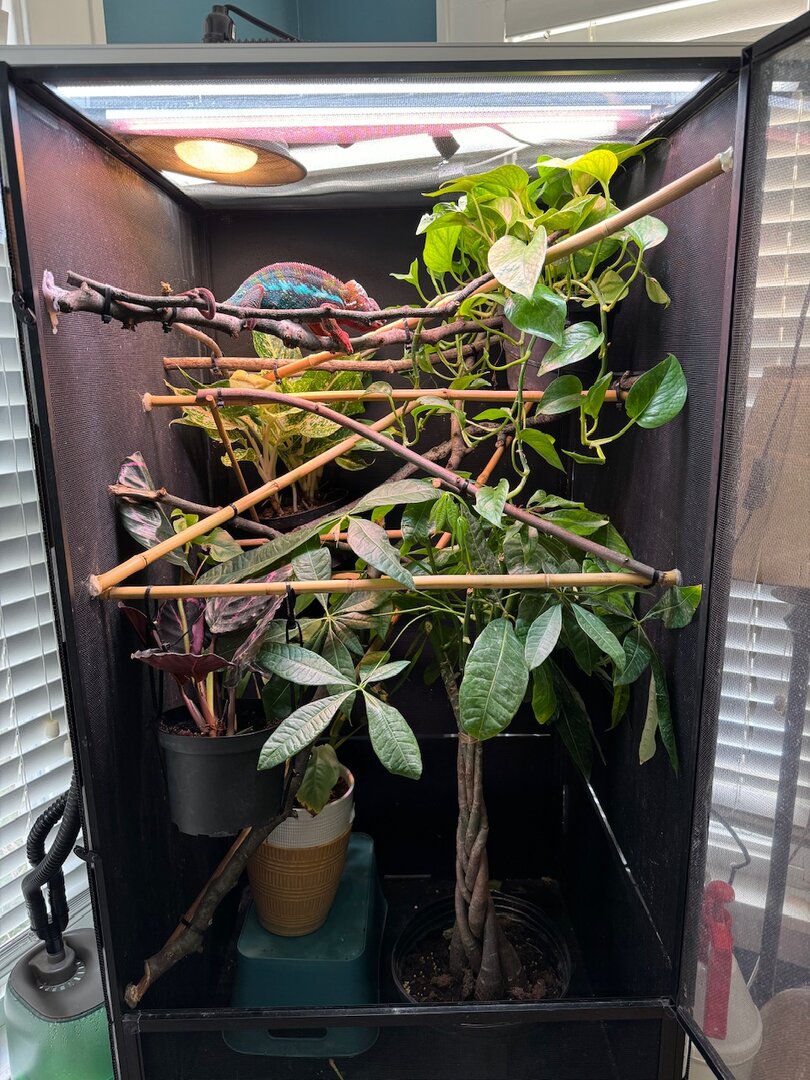 - Lighting - Arcadia 6% UVB, 36” fixture (the new one is 24”), 60w halogen for basking, a daylight LED bar and plant light