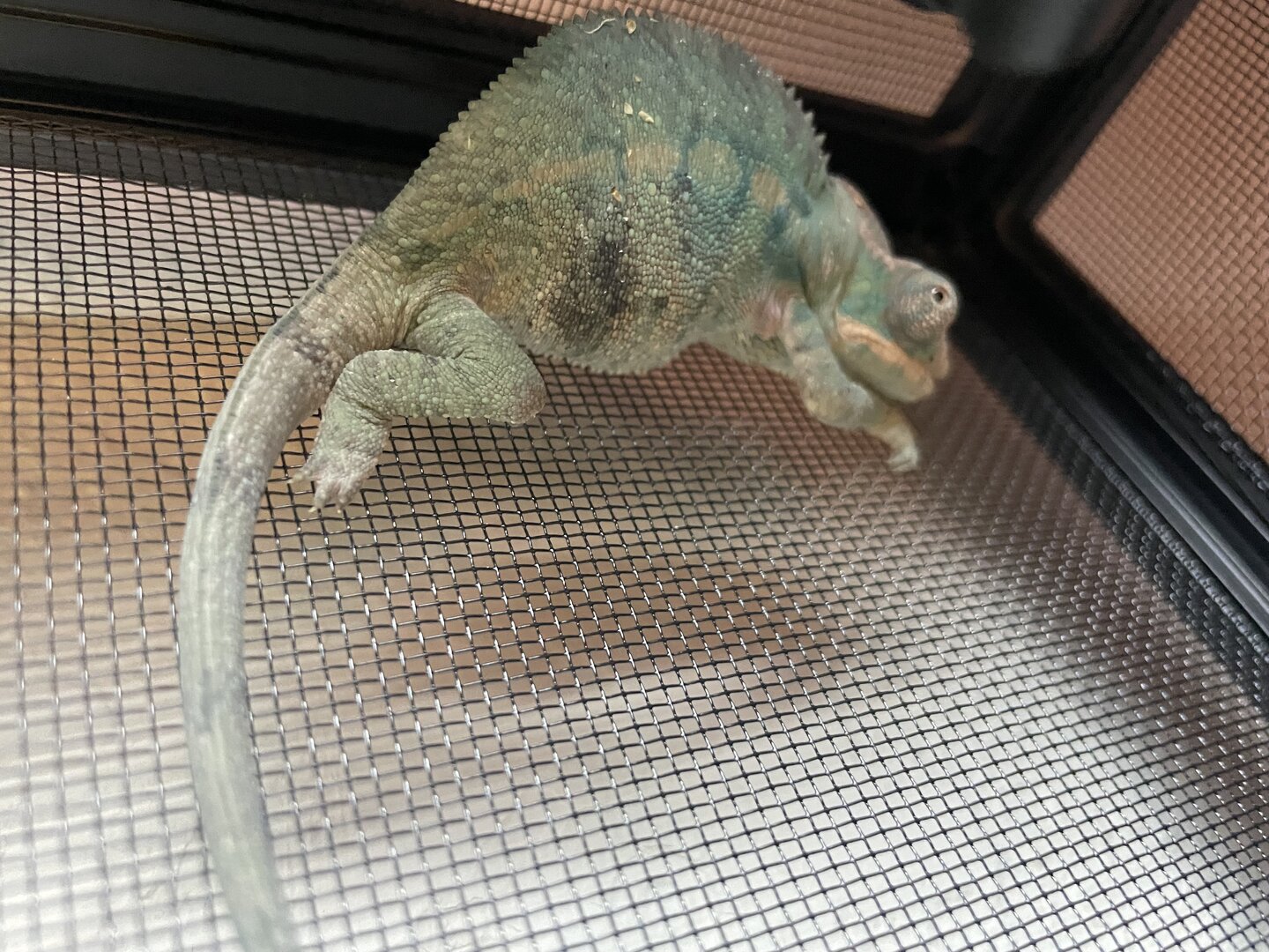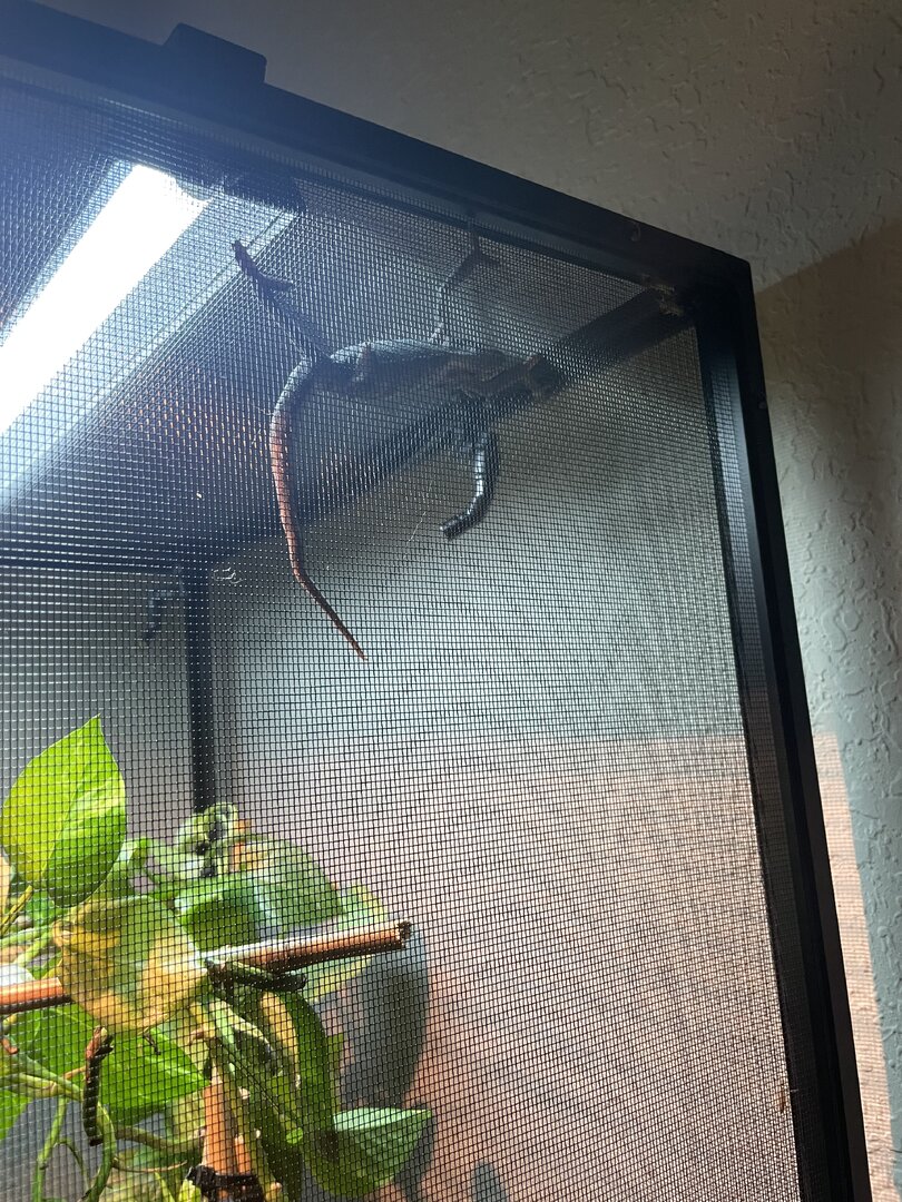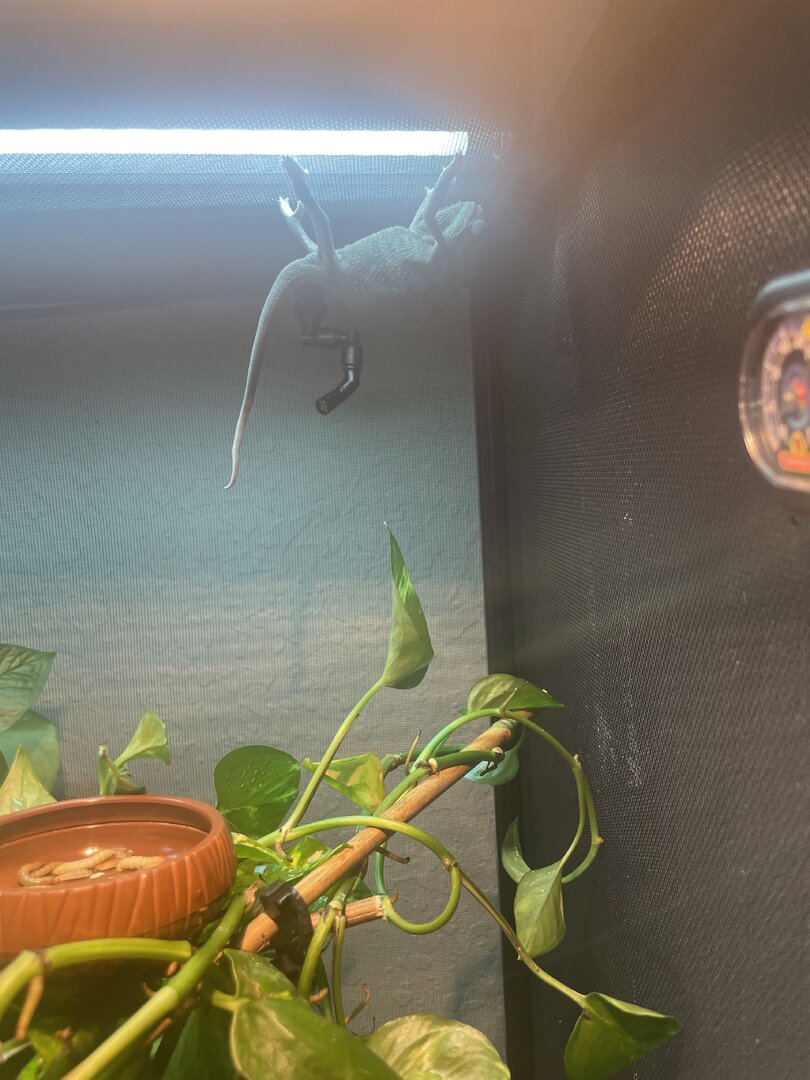 After being a little “spicy” about me removing his holding himself he can climb branches normally and he has no issues climbing the cage mesh to hunt crickets. He is eating.