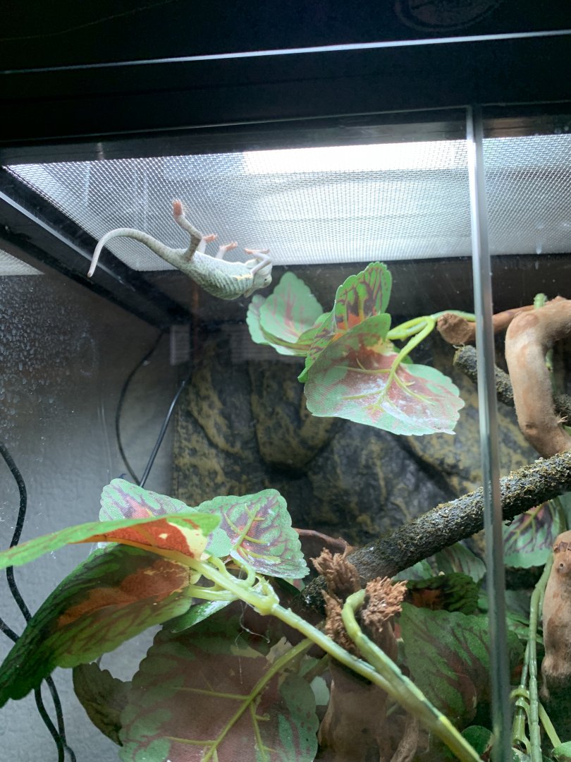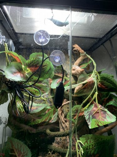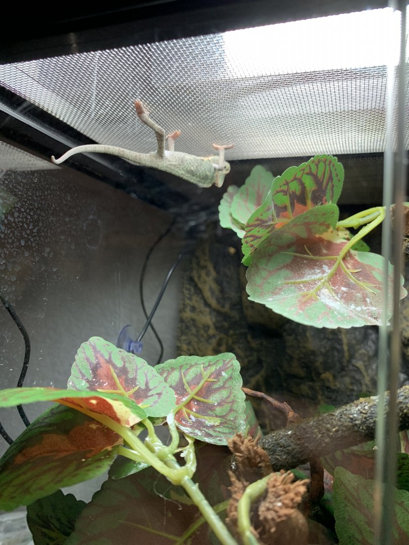 Current problems: As mentioned, color change is worrying me because it's happening for what seems to be no reason. Also if you have any tips for feeding that would be awesome! I struggle with crickets so much because I place them near him and they fall off. My cage set up has hiding spots for them so it's a struggle. Also substrate is getting puddly so i'll be removing it fully as soon as I get the chance and keeping it out for good. I just recently got a huge pond formed in the cage from misting without realizing it so I cleaned the cage fully and put a small layer of substrate. Next time i'm just going to keep it empty.