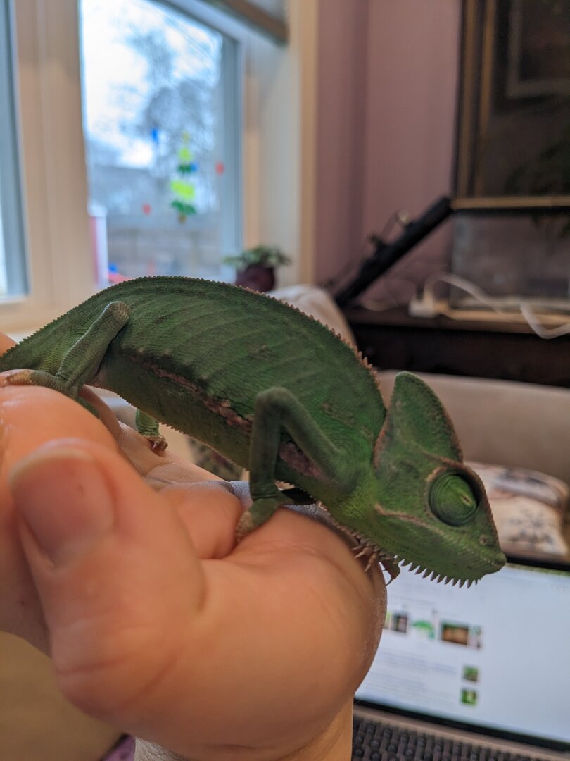 5) I was given no instructions on how to properly handle Cammy (nor told that chameleons don't really like to be held!) I picked him up once or twice as I would a mammal, very gently but around the middle, to clean his cage and whatnot, and just yesterday I noticed that maybe his ribs are a little.... Not right. I honestly don't know if he came to me that way, or if I'm responsible. Is there anything I can do about this? I'm so sad.