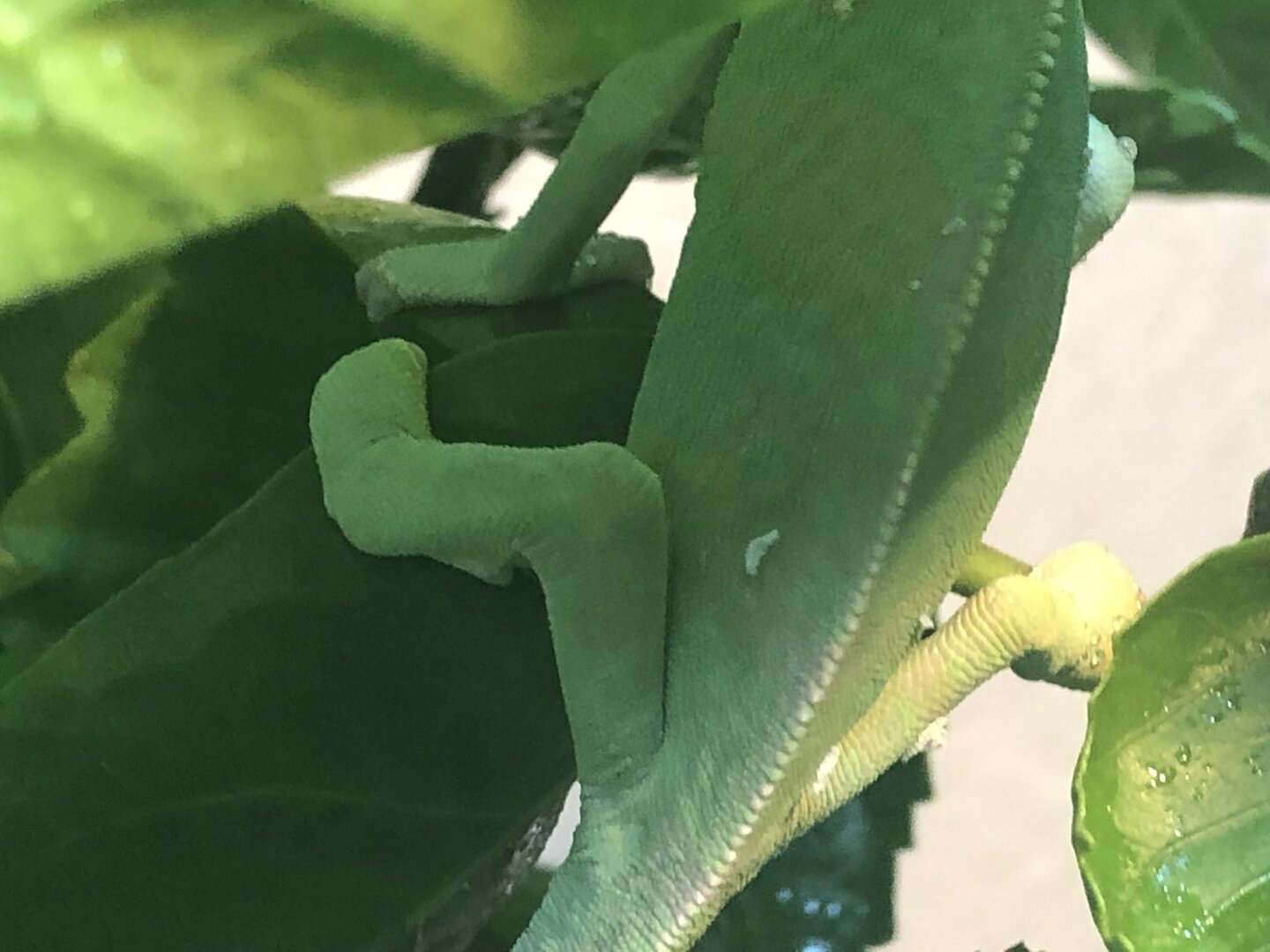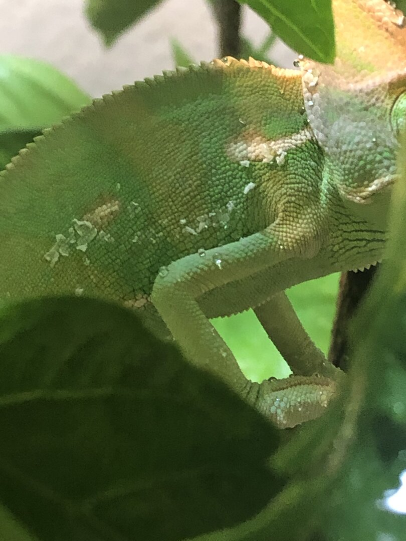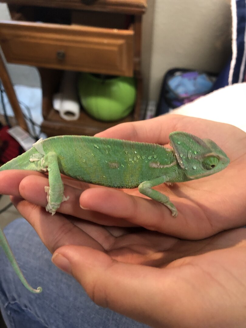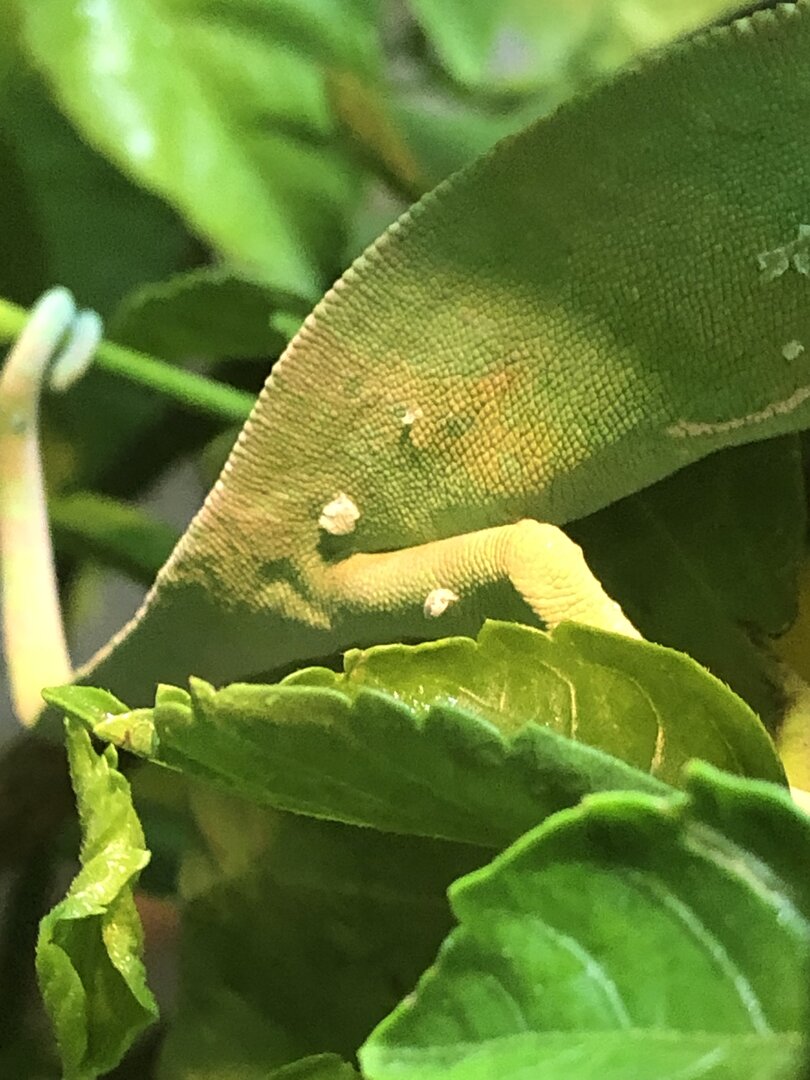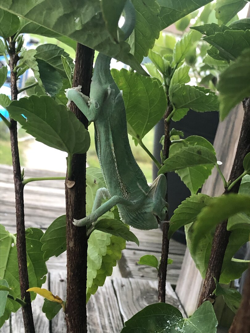 Got a little juvenile male veiled chameleon from petsmart. He’s not in great condition at all, very under weight and looks to have MBD just from how is leg was positioned and is in shed so they let me take him. Took him home and he ate some dubias and crickets and I just tried to heavily dust them with calcium without D3 and multivitamin. He’s under a t5 Arcadia 6% bulb and and heat light rn but I don’t have a cage for him so he’s just free roaming on a small hibiscus tree. I’m seeing how he does through the weekend and taking him to the vet as soon as i can before ordering a cage and supplies for him. Couldn’t let him die at petsmart so I’m gonna try my best to save him.
