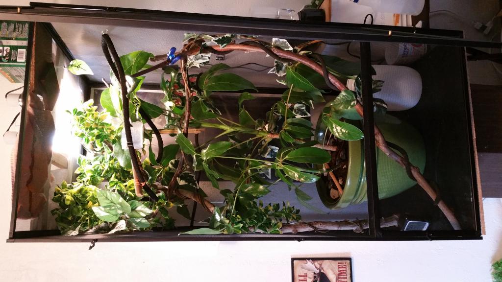 Zeus's cage is a Reptibreeze 24"x24"x48". After I upgraded to a bigger cage, I had to buy lots of extra vines and plants to fill in the extra space. He really liked it until I put the real Umbrella tree in there. I thought he would like it, but he seems to not move around quite as much. Maybe his tree is too big? I like it, but maybe I need to trim the tree down..? Any thoughts? Thanks!
