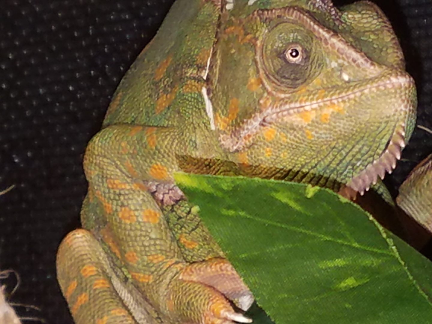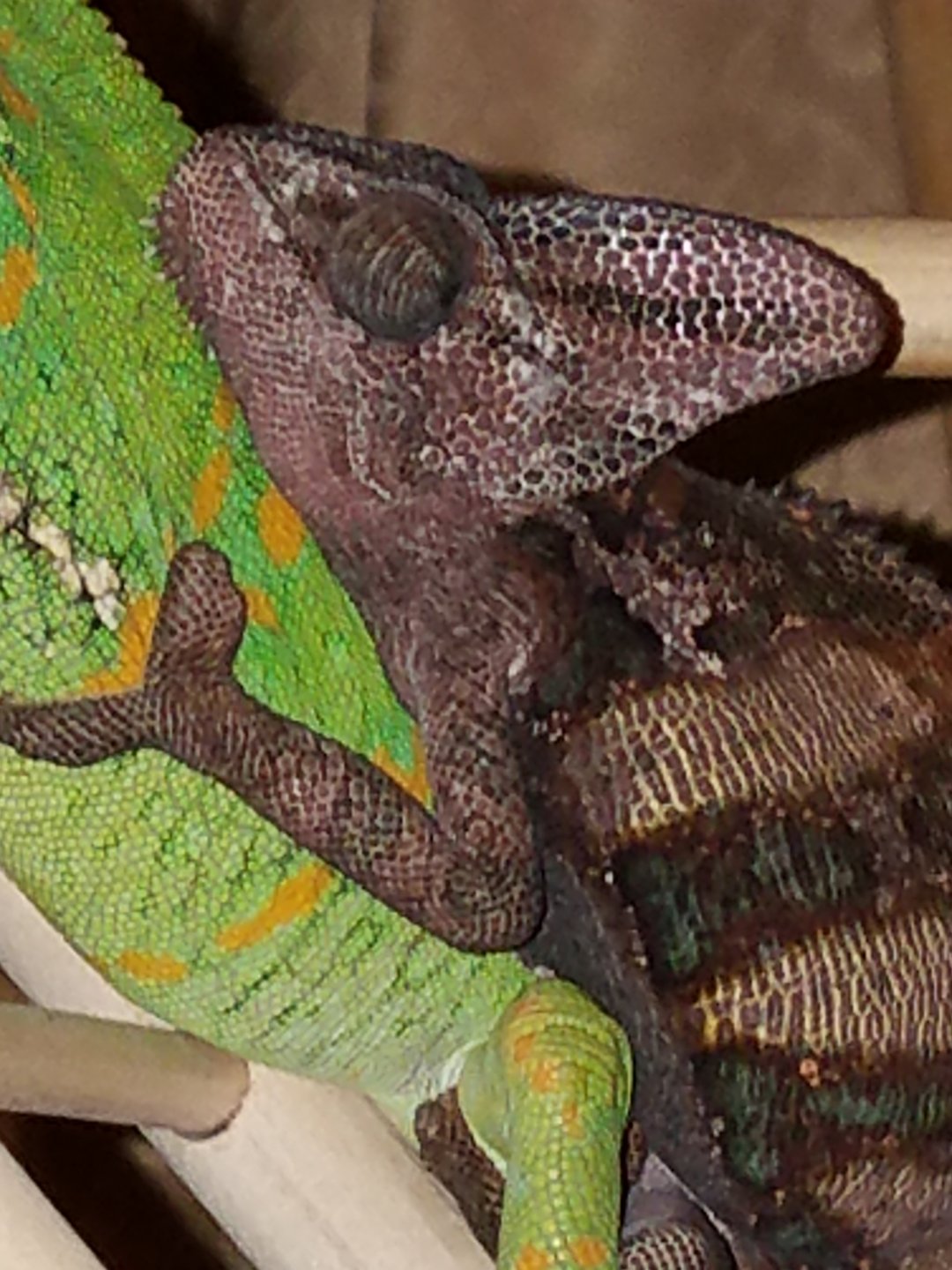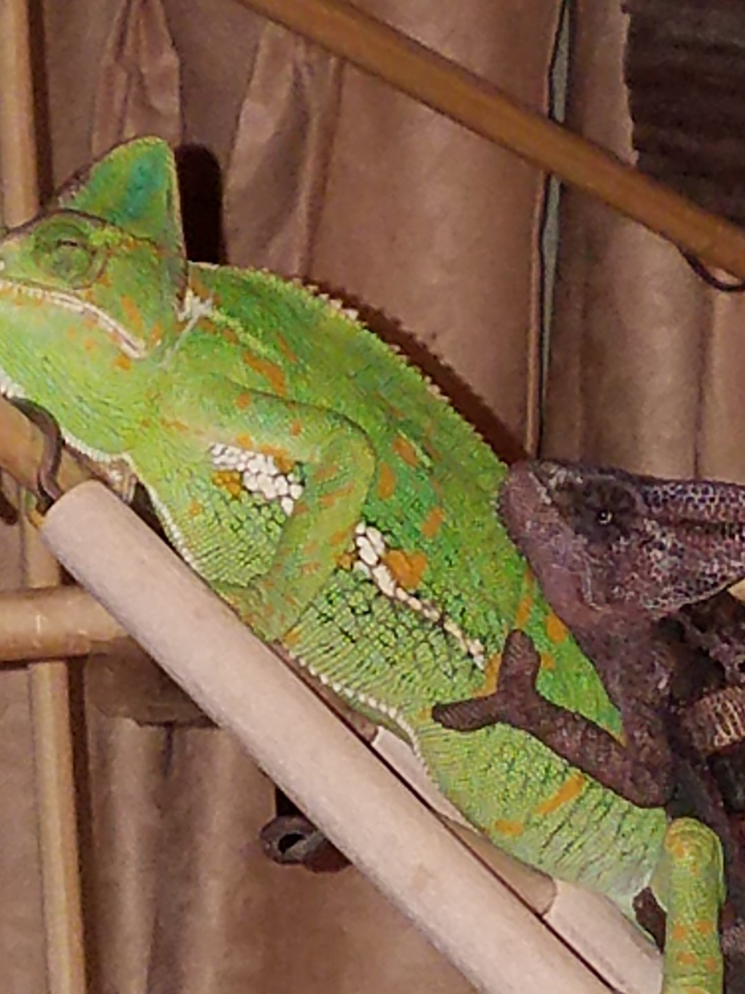 I had Jade out of her cage with my new male veiled Romeo, and he's just a baby -- I got him at the end of November at the Expo -- I wasn't expecting anything but Romeo to indicate some fear from Jade, and thought he would act submissive.