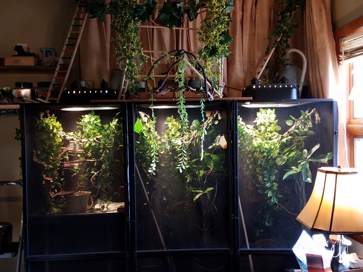 I left them alone for 3-1/2 hours, until it was bed time. I grabbed the tangled mess of legs and tails, got the bundle into Jade's cage, and then proceeded to remove the male.