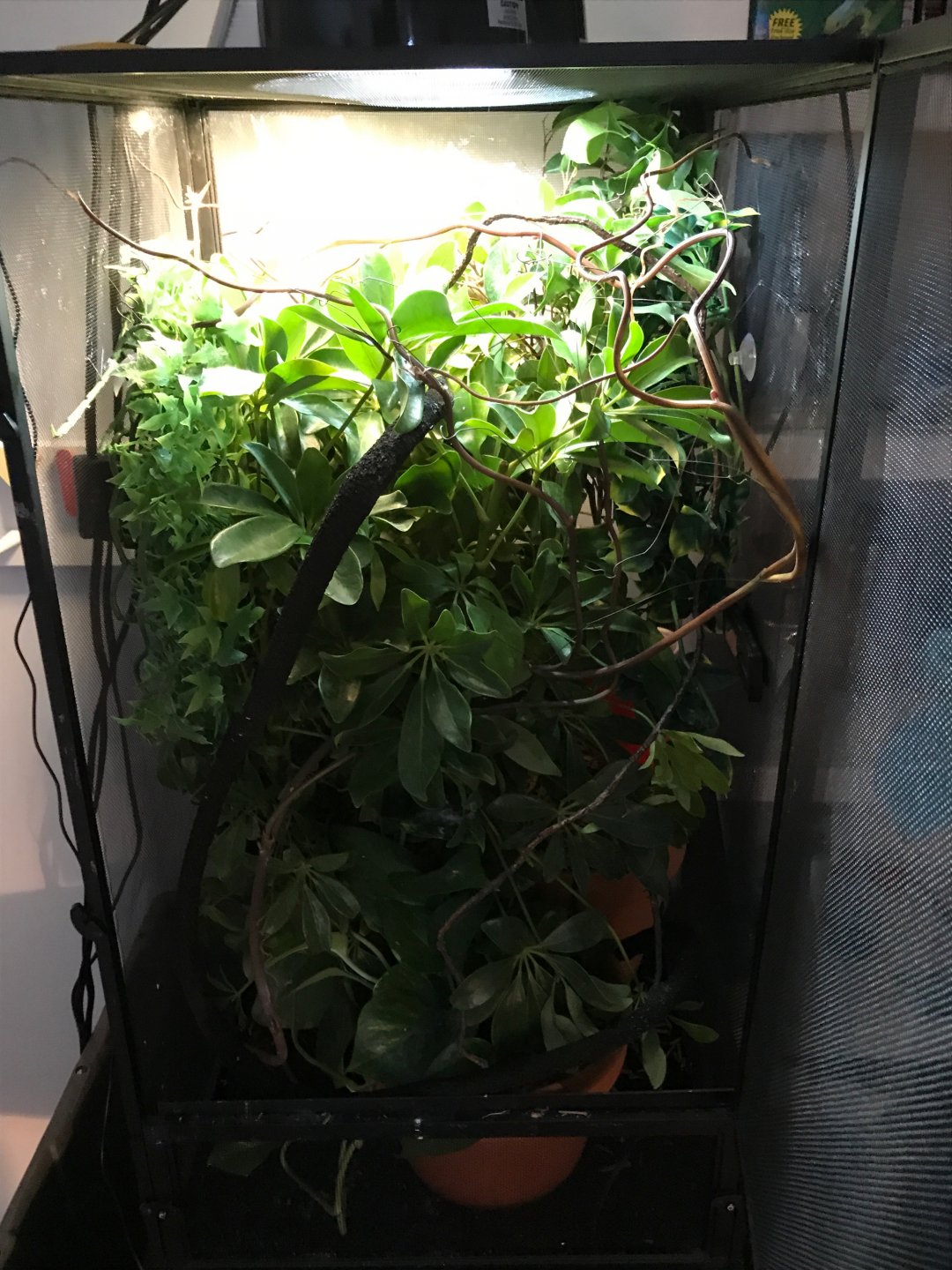Hello! I'm not going to be setting up my chameleon tank for a little bit, but I do have some questions. If I do use live plants, what type should I use ( I'm going to be keeping a Veiled ) I've read about that pothos and hibiscus are good. If any of you have have chameleons in planted tanks, could you provide pictures? Or would it be better to use some real some fake, or all fake. Also, how would I put the plants in there, like how would they potted? Thanks![/QUOT