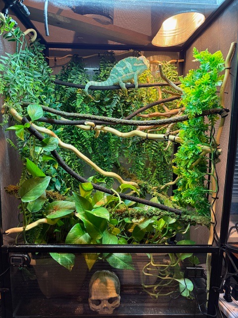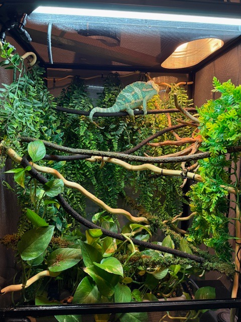 Cage Info: 24x18x36 Exo Terra cage with drip pan under screen floor, 2 live plants in cage, many fake plants and foliage, many vines and branches throughout enclosure, one closer to right/ top for basking, ledge feeder, Lugarti dripper.