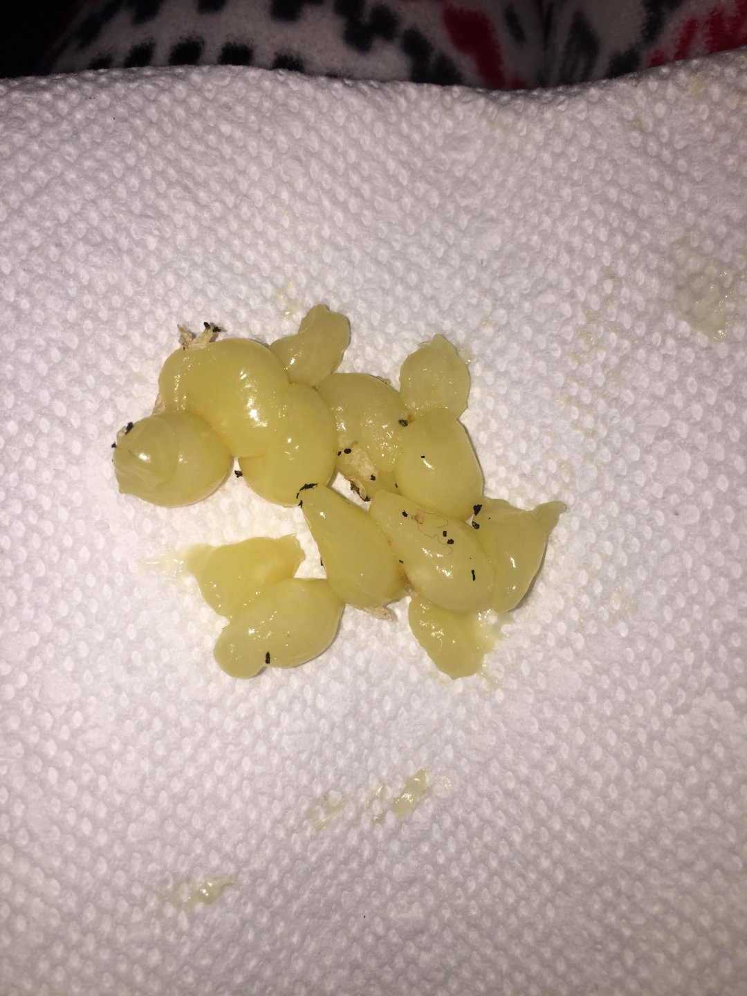 I’ve noticed recently she’s been storing a lot of fat, as in she’s gotten a lot chunkier than she’s been. She’s always ready to eat, so that doesn’t surprise me. Though when I woke up this morning to turn her lights on, I found her upside down with these attached to her and on the floor of her cage.