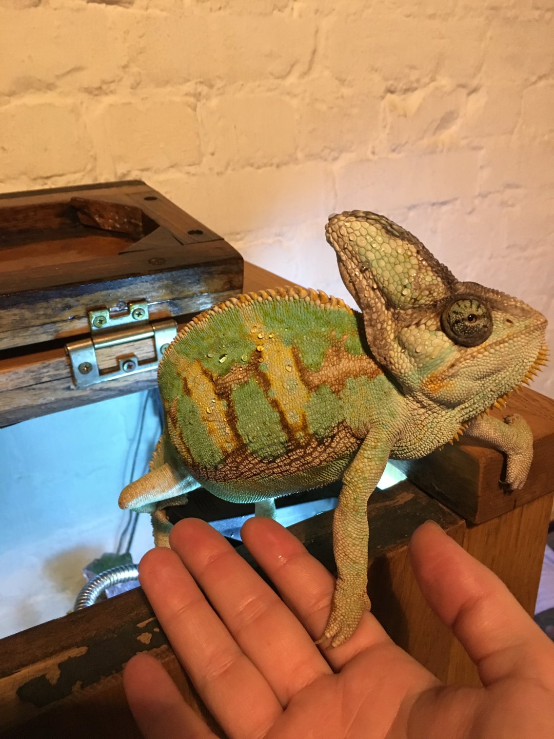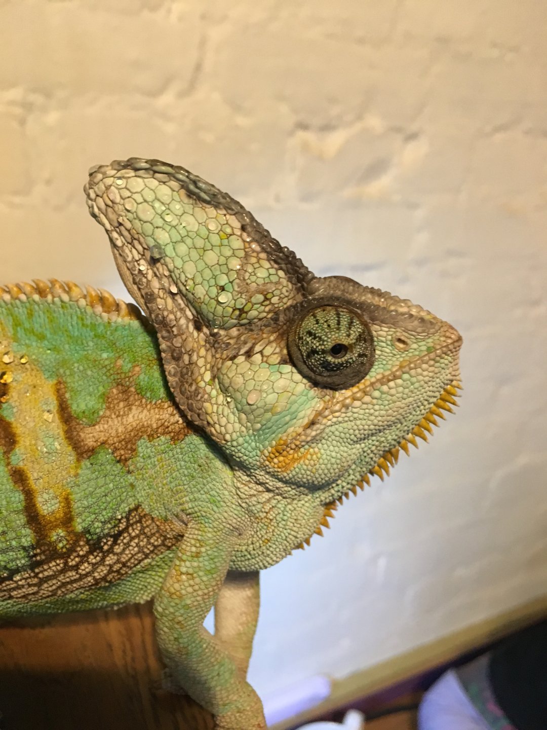Current Problem - My cham for the last couple of days being very lethargic, become very clumsy and I've seen him falling down from his twigs … today I found him laying on the bottom of the cage so very concerned … I've picked him up … his grip is still strong but not as strong as before (before he was stopping the blood circulation n my fingers), usually he eats his worms and I refill his dish twice a day but for the last 2 days he haven't eaten a lot …. usually when he goes t sleep he was more compact with his tail curled in a coil last night and tonight he is stretched out on the twig laying on it and his tail is relaxed and not on a coil. I took pictures of him today managed to climb out of his cage which I will attach and I took picture of him how he is sleeping at the moment. View attachment 218864 View attachment 218865 View attachment 218866 View attachment 218867 View attachment 218866 View attachment 218867 View attachment 218868 View attachment 218869 View attachment 218870 View attachment 218871