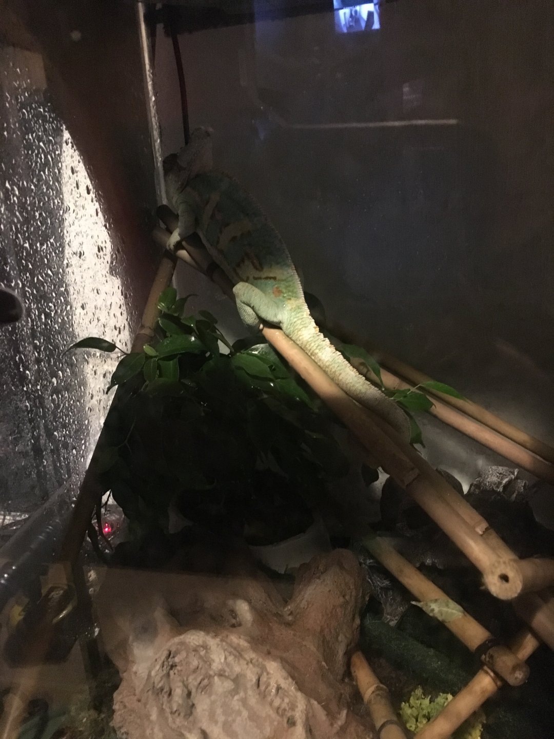 Current Problem - My cham for the last couple of days being very lethargic, become very clumsy and I've seen him falling down from his twigs … today I found him laying on the bottom of the cage so very concerned … I've picked him up … his grip is still strong but not as strong as before (before he was stopping the blood circulation n my fingers), usually he eats his worms and I refill his dish twice a day but for the last 2 days he haven't eaten a lot …. usually when he goes t sleep he was more compact with his tail curled in a coil last night and tonight he is stretched out on the twig laying on it and his tail is relaxed and not on a coil. I took pictures of him today managed to climb out of his cage which I will attach and I took picture of him how he is sleeping at the moment.