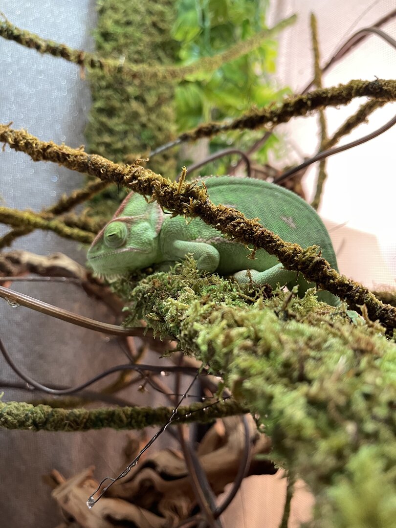 - Watering - We have a humidifier that is set to 55% and we mist her cage throughout the day with the exo-terra misting bottle for about 30 seconds to a minute. Before she started acting different, we would see her drink water but now I don’t see her drink any at all, she used to go to the top of her cage when she was thirsty too and we would give her water then.