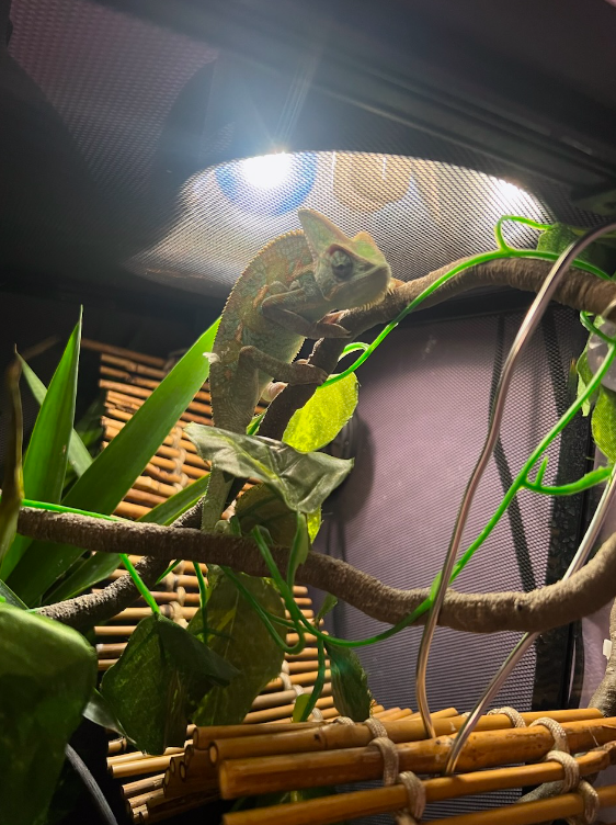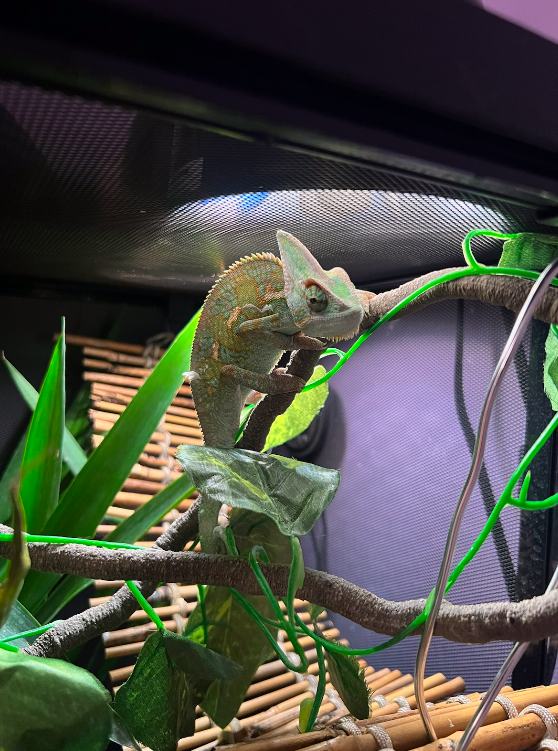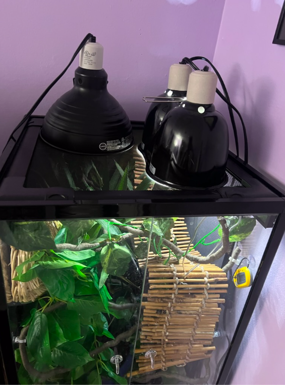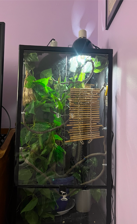 Habitat- (photo attached below) Mesh enclosure with glass doors at the front, contains fake plants/vines and two live plants (Dracaena and golden pothos). Her enclosure is in my room but I'm rarely there during the day so she gets a lot of alone time.
