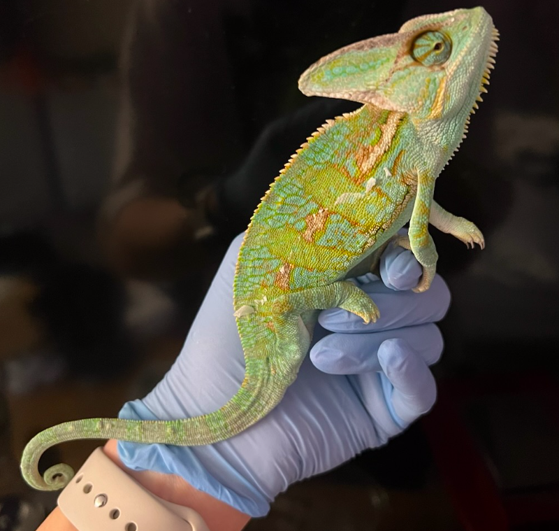 I have an 8 month old (I believe female) veiled chameleon named Kiki. She is my first chameleon and of course care about her a lot and want the best for her. I got her in October and she was thriving the first few months I had her and she grew pretty quickly. However, lately she seems to be having some health issues. Starting around the end of January she stopped eating- she began shedding shortly after that, so I thought OK this could be normal. I continued to leave crickets in her bowl every day with no results. Then tried bringing the crickets closer to her basking area because I thought maybe she was having trouble seeing them. One day she tried to grab one, but couldn't because it seemed like she was having trouble extending her tongue. I ended up using my tongs to grab the cricket and put it in her mouth. Since then, she'll look at the crickets but hasn't tried to grab one. I've started force-feeding her because it seemed like she was getting weaker. I'll usually spray a drop of water on the tip of her nose and when she goes to open her mouth I'll put a cricket in there- I'm just trying to keep her alive at this point because I know things can turn very quickly when reptiles stop eating.