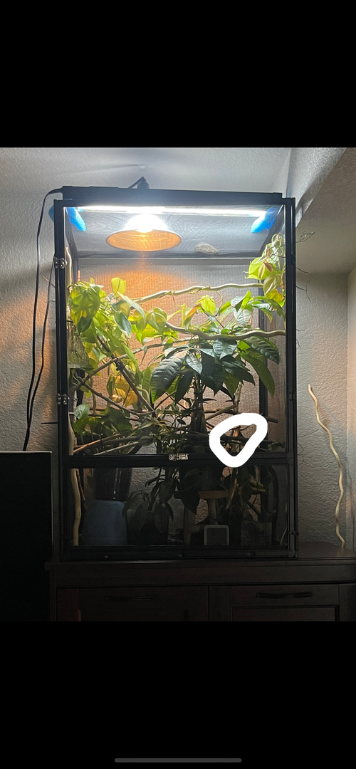 Circled area is where he is hanging out. Diet- crickets, hornworms , (have tried Dubias and he won’t touch them, have some bsfl arriving today to try. Dust without d3 weekly, and reptivite twice a month We use a dripper for a bit everyday and mist after lights off and before they come on. He hasn’t been eating much lately but he was shedding so I figured that could be part reason Spike is also 4 years old.