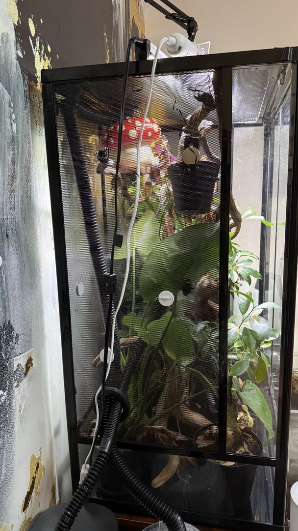 - Watering - Misting morning, afternoon, and night. I usually don’t mist in the afternoon but he’s drinking a lot so I started misting him more often. Fogger typically goes off at night only, but have started running it during the day on a low level because humidity is dropping to about 20%