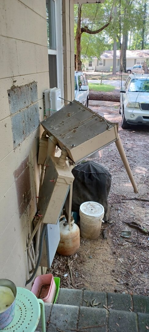 Long story short, a tree fell on the main power line due to termites and now it's left my critters and myself in the dark. The problem is in the process of the collapse it ripped out the power box from the side of the house....