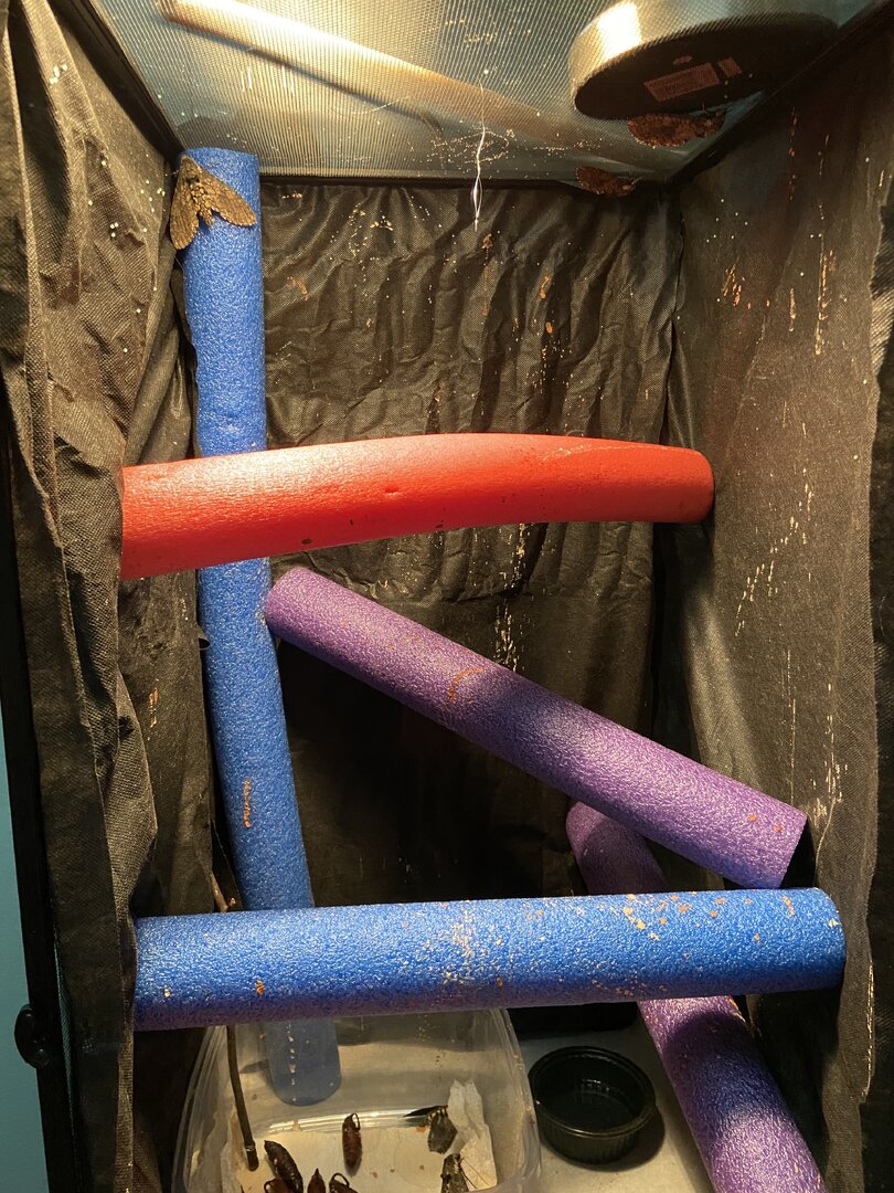 The hawkmoths need to be able to climb and hang from something in order to fully unfurl their new wings and let them form and dry properly. This is my current set up. I use pool noodles and landscape fabric because the eggs come off of those easily. I’ve tried branches and plain screen and the eggs stuck and were destroyed when I tried to collect them. Also, I do have a small branch in their little container that I put the chrysalises so they can climb. This current batch didn’t seem to understand how to use the hummingbird feeder so I put their nectar in a small bowl. And yeah…everything was clean when I set it up. They excrete a lot of stuff while breeding.