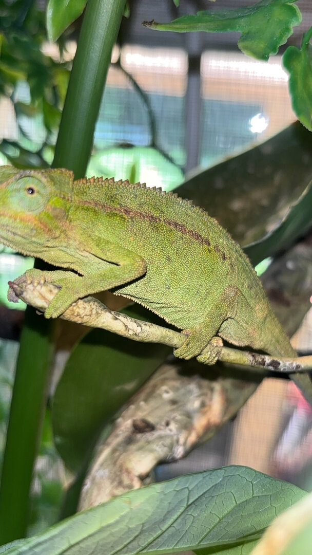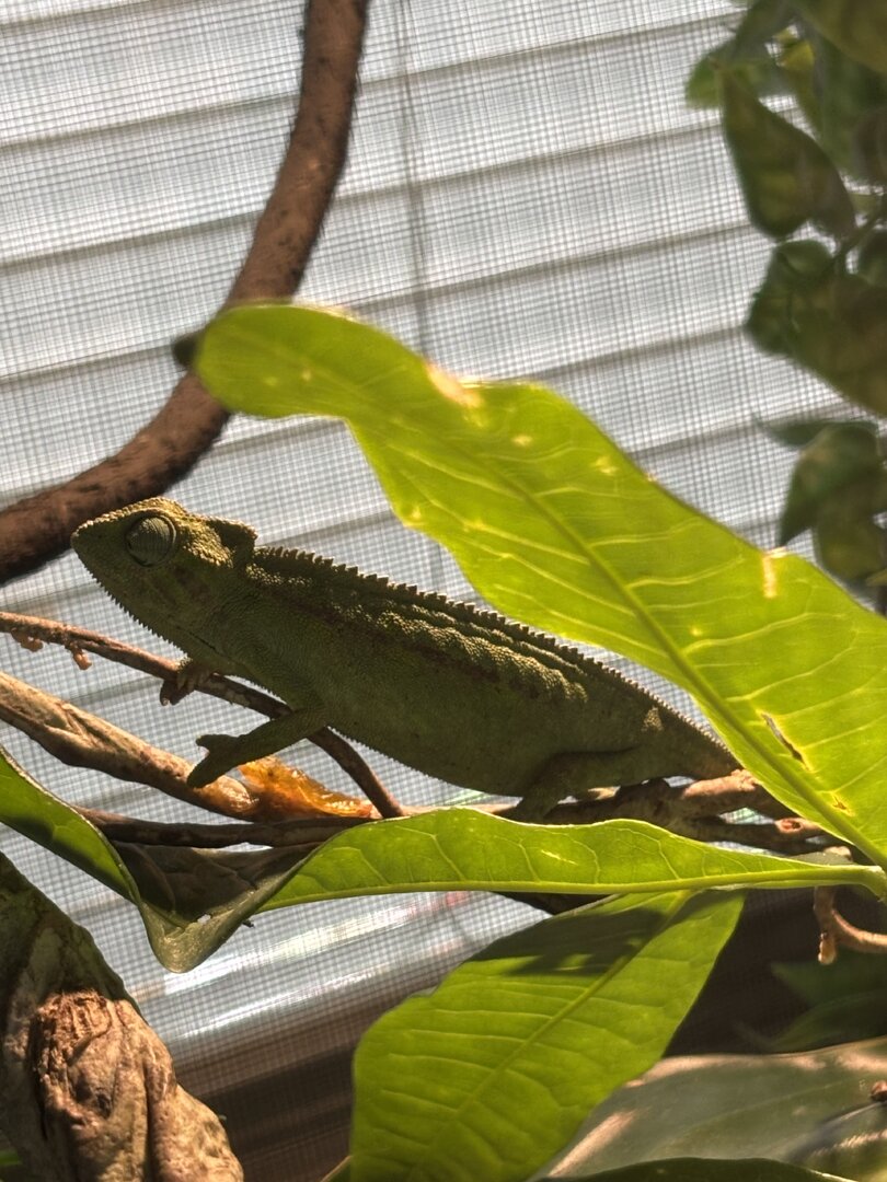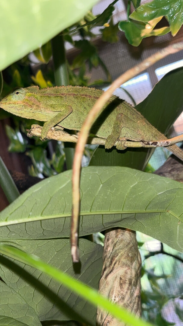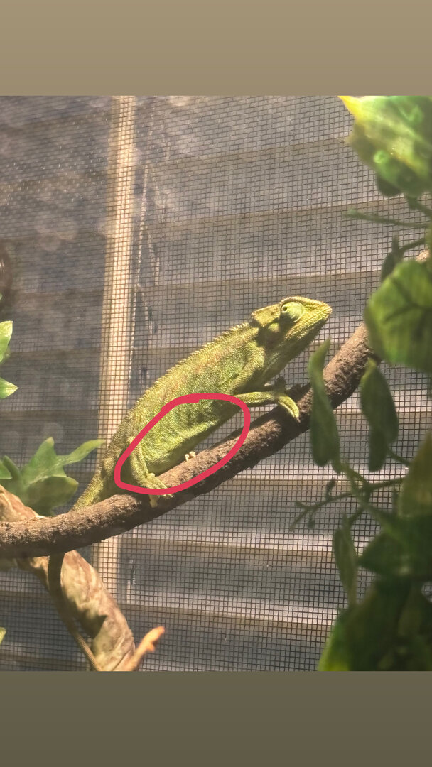 Hello again! This is a female elliot’s chameleon and I checked on her while she was sleeping last night and I saw this pouch on her, Is she pregnant or is something other than that? She has been sleeping in very awkward positions and basking a lot. She also is refusing to eat. What does this mean?