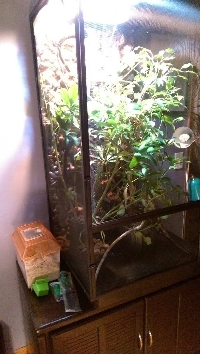 So minor update. No new enclosure yet, but I got the new cabinet set up and ready. His current enclosure is just set on top of the new drain pan.