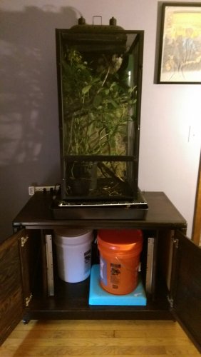 His cabinet is about done, drain pan is assembled, and back wall is cleaned up and cut to fit in the drain pan without obstructing the drain hole. Got zip ties ready, and just need help getting that table he's on now out of that room so I can bring the new one in. Really can't wait to pull it all together. I've been showering with a ficus for a week now