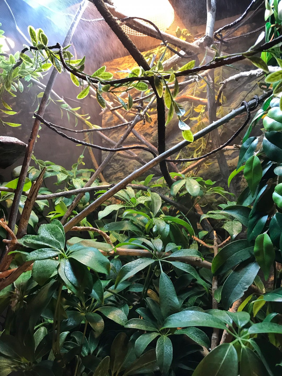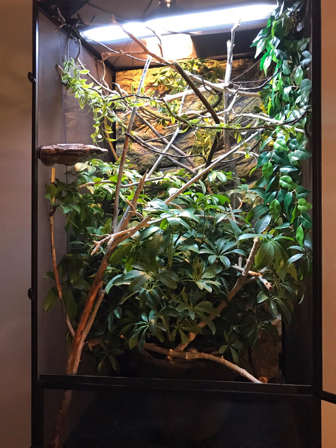Plants - Large, live Schefflera arboricola in bottom half of enclosure (plant has been washed and repotted in organic soil, with screen and river rocks placed on top so he doesn't accidentally eat soil), branches from outside that have been properly sterilized, plus fake plants and vines in top half
