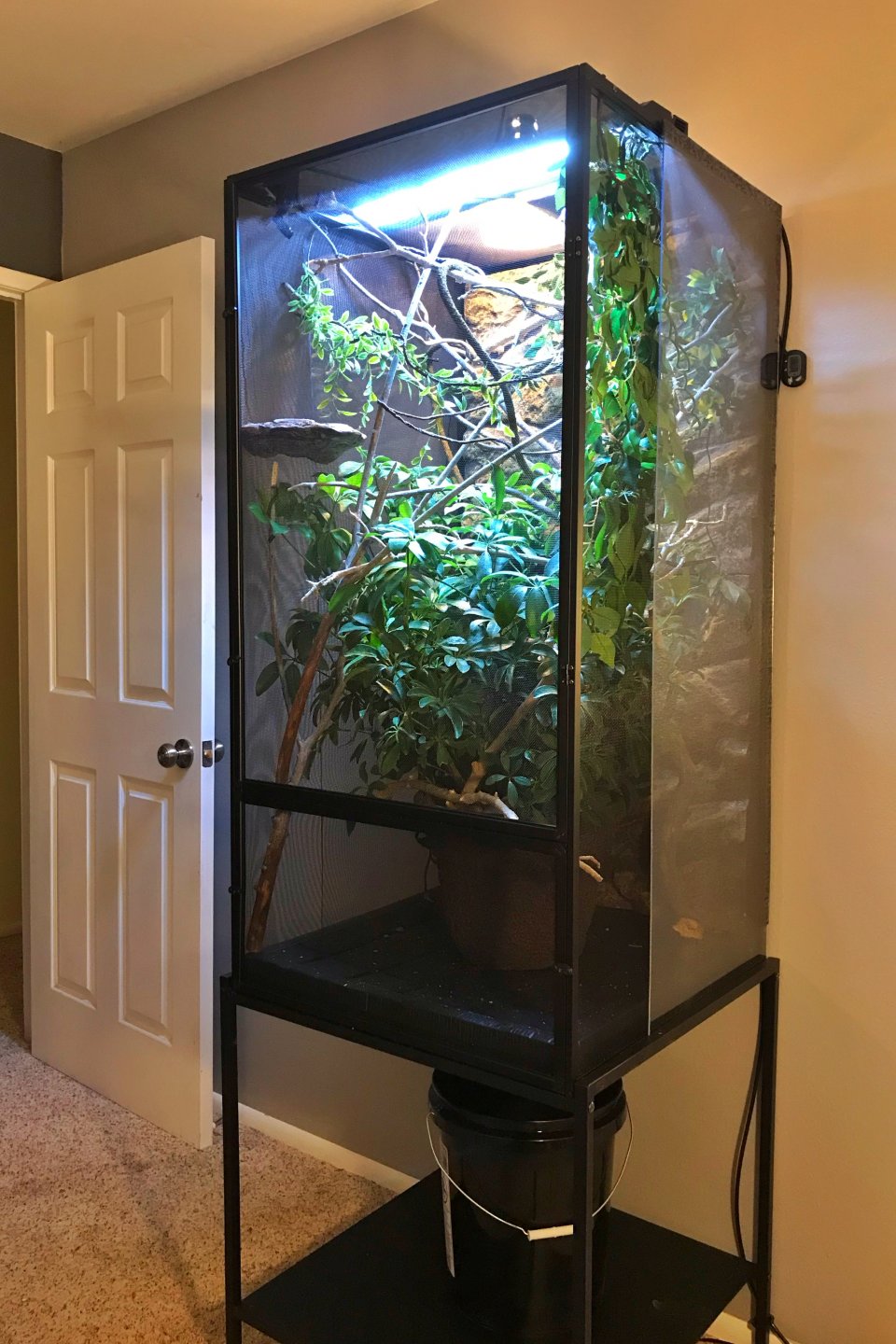 - Reptibreeze XL 2'x2'x4' screen cage. Top has Plexiglass sheets over top screen EXCEPT where lights are, and back has 2 Exo Terra 24x24 backgrounds stacked and attached to back panel, plus two 18x48 Plexiglas sheets are installed with velcro over the left and right side panels to help contain humidity, since Denver is very dry. Cage is set on Reptibreeze stand, with a bucket on shelf underneath for drainage. The bottom of Cage is replaced with a XL Reptibreeze Substrate Tray (no substrate), and I've installed two small screened drains that line up over bucket below. I've tested it and drainage works very well. I realize this is a very big enclosure for a baby so if it's not working, I'll remove the large plant and section off half of the enclosure so that it's half as big, but since the plant is helping with the humidity, I'm hopeful I can keep it in. We are planning to cup feed.
