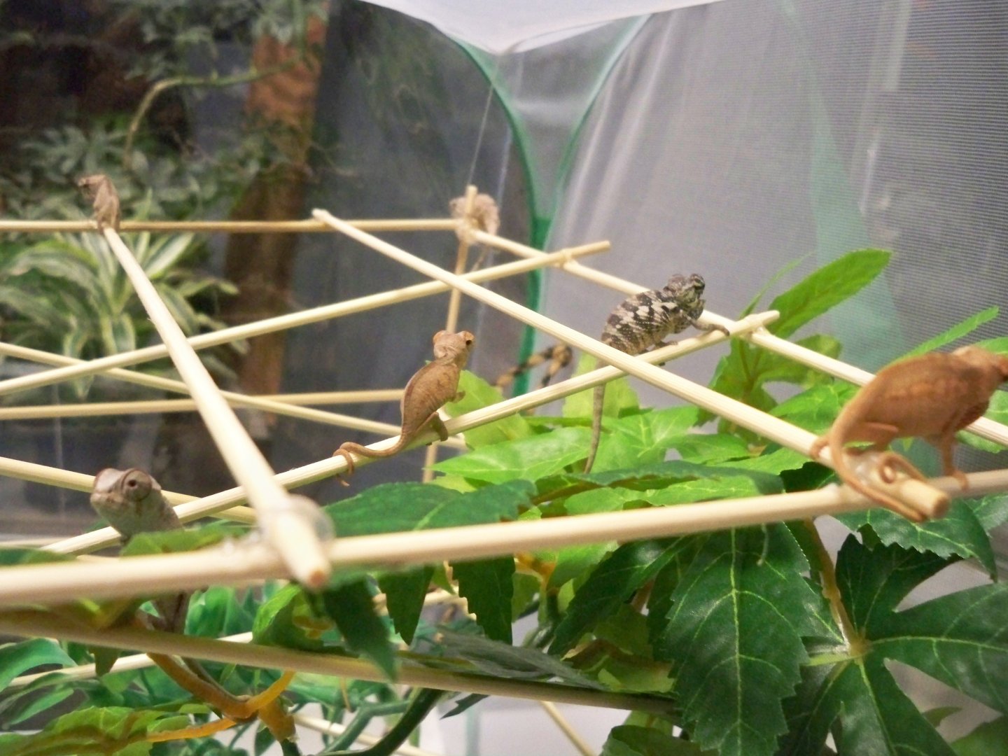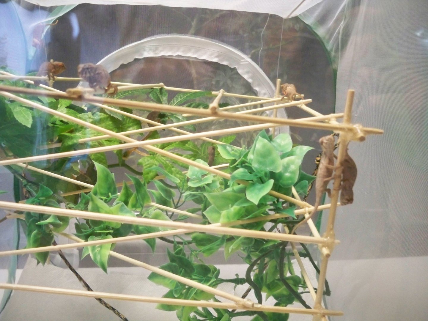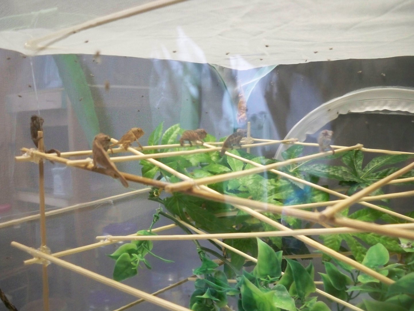 Trying a new nursery style. Small butterfly enclosure with a structure made of skewers. ALOT of work to make it functional. Fruit flies clung to the sides and top of the enclosure and the babies were able to nab them. I still need to monitor temperature over the next few days.