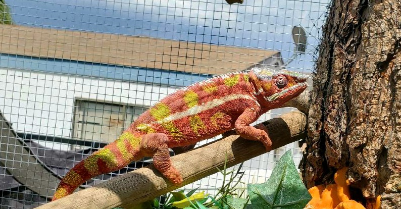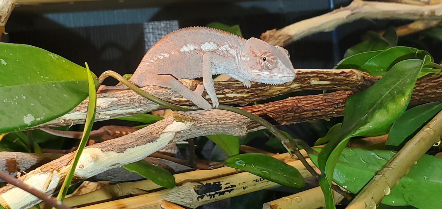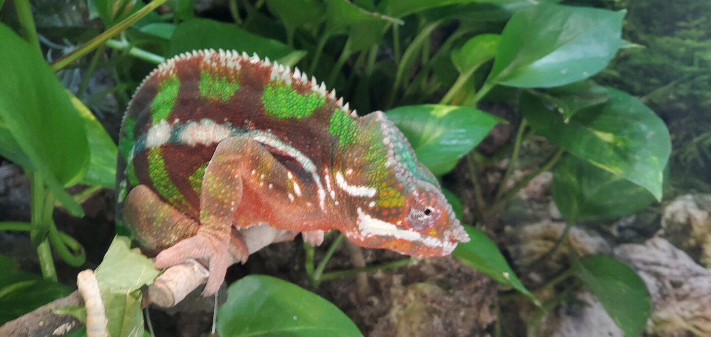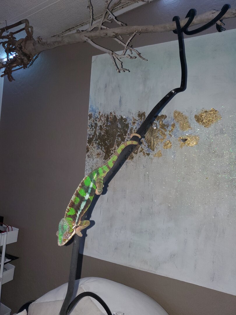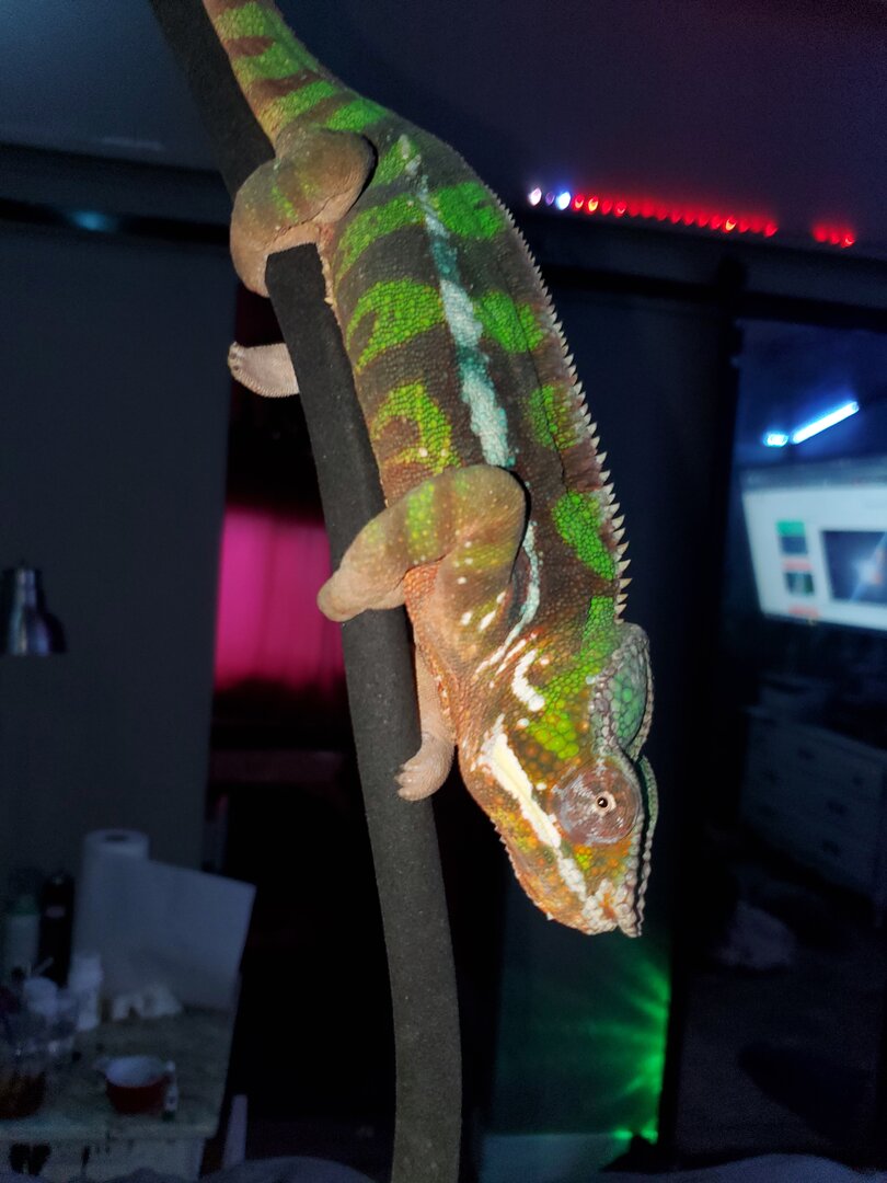 Sire ~LEIF~ is from Kammerflage. He is 1.7 yrs old, Weighs 207 grams, perfect health, gentle temperament and extremely friendly. He will grab onto you if possible. He is green body, maroon bars with blue stripe that also turns pure white. When fired up or hot, he is lime green and light red.