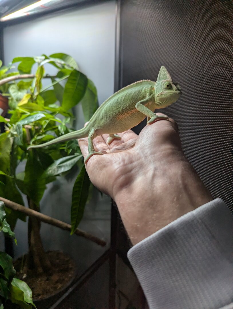 So I want to make this post that after months of hand feeding and positive interactions, my veiled chameleon indy has finally trusted me enough to come out onto my hand, I know they don't bond but I beg to differ from the look she gave me when I opened her cage door and she just ran out onto my hand and refused to go back in her cage without exploring me first.