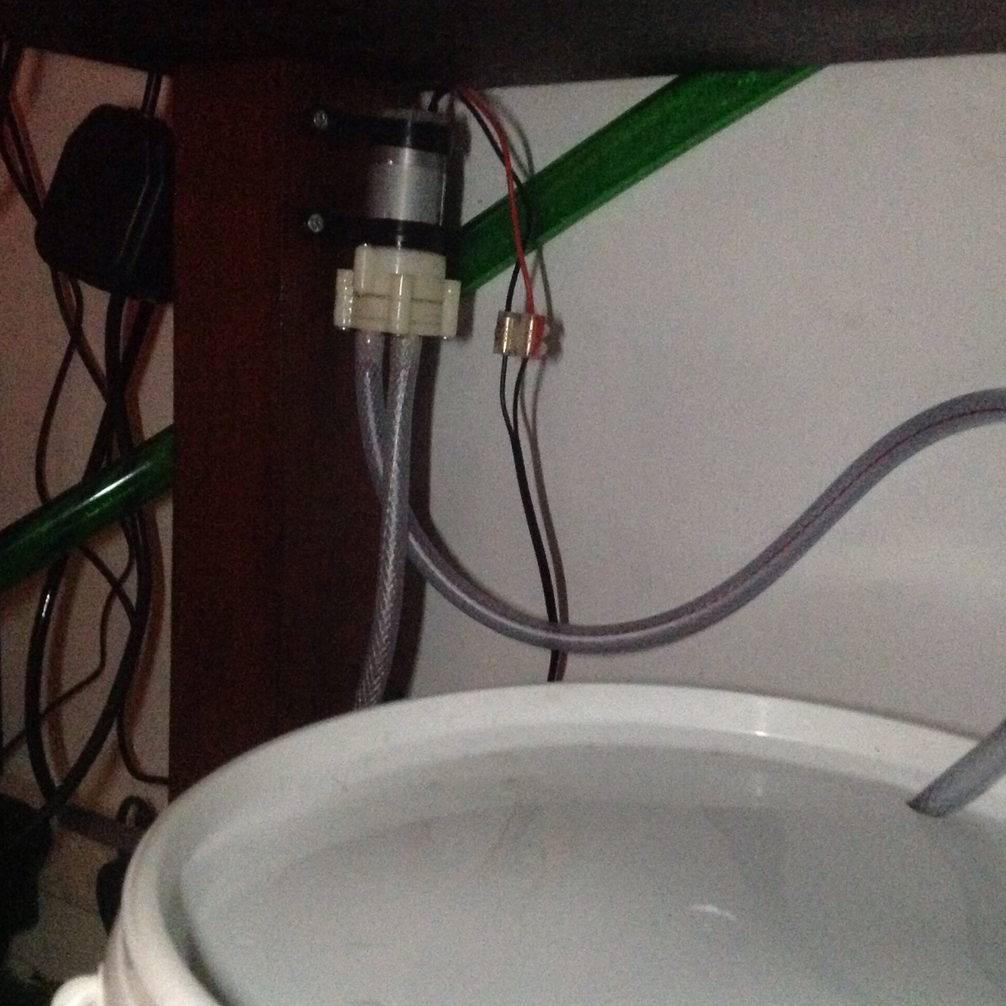 I then looked more into a 12 volt water pump and came across the perfect little thing. It's a 6/12 volt air/water pump (doesn't matter if it runs dry) with a flow rate of 1 to 3 litres per MINUTE as the other pump used nearly 13 litres a minute. This pump is not submersible so it has to be mounted somewhere and is VERY QUIET when running. This pump also had the head height of 3 meters and a suction range of 2 meters which was more than enough. So then I bought a larger 10 litre water container/bucket with a lid.