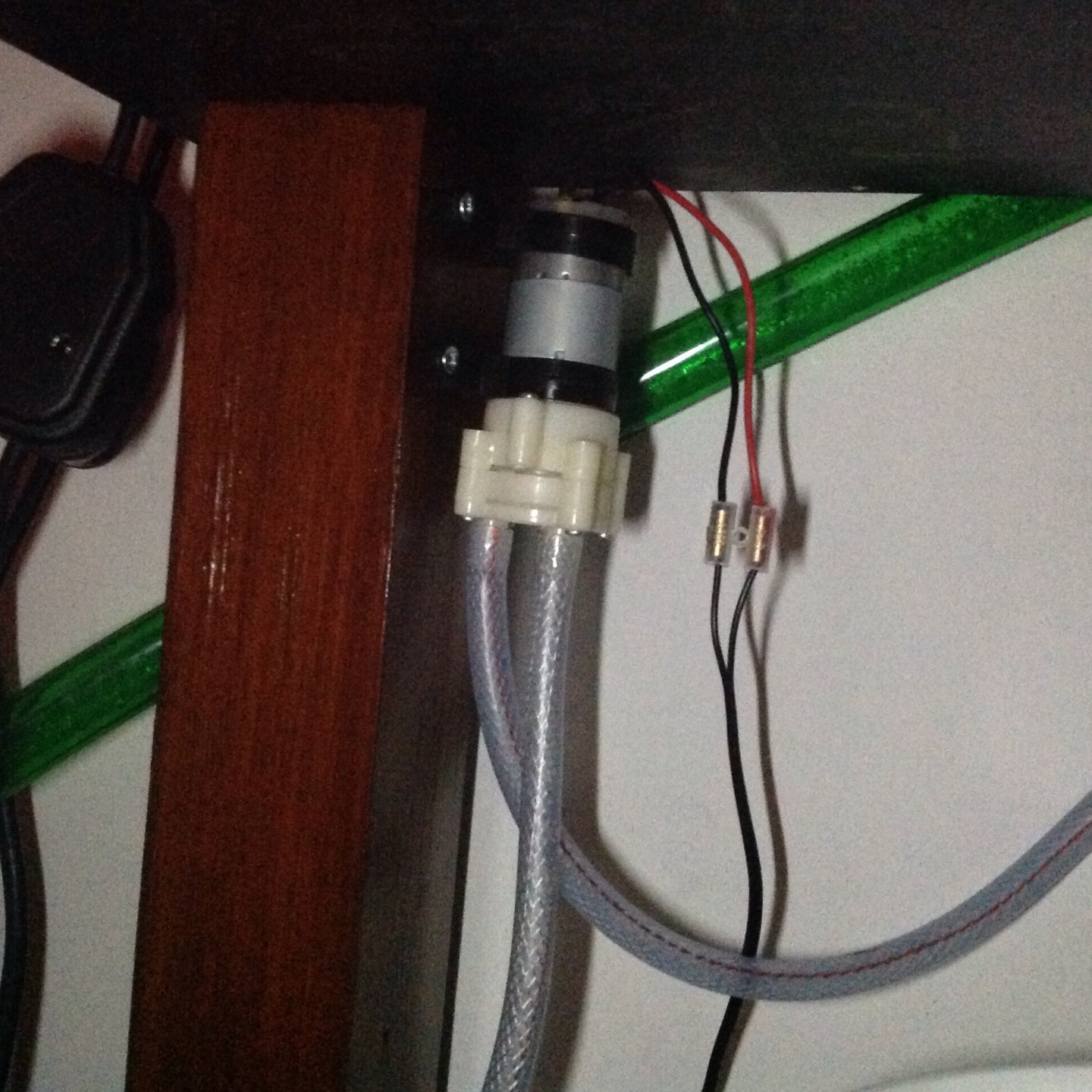 So next was the pump, water container and heater......easy. Put the water heater in the tub, I had to extend my lead on the water heater as it wouldn't reach the plug. If your good at diy and put your mind to it anything can be done. I've set the water temperature to 30 as I think that's a nice temp. I soldered a positive and a neagatve wire onto the water pump and put some heat shrink around the ends. I then joined the wires up with a 6 volt transformer plug as 12 volt had to much pressure inside the cage with the 4 nozzles. I had to put a bit piping from the pump ends into the irrigation piping as the irrigation piping is 4mm and the pipe ends were about 6/8mm (can't remember). Once again if your good with your mind you could make it join up in many ways.