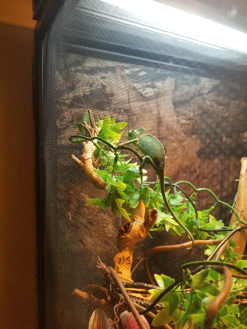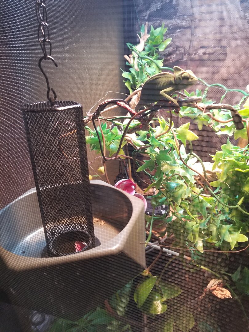First off, I am so glad to find you all. I am new and learning so much. I've had my female veiled chameleon for just a little over a week. The first day I fed her she ate 3 small crickets out of the homemade half gallon milk jug feeder hung on the side of the cage, plus two that had escaped and crawled up the screen.. she went right up after them. The next day my new "real" feeder came in the mail.. and it looked so much better than the milk jug, I was excited to set it up. It didn't take her long to eat out of it, she even climbed on it herself. But the day before yesterday she only ate one cricket. several had escaped into the cage, but I found them and got them out before night. Yesterday I don't think she ate any of the crickets. They all sat very still down inside the feeder, and it was like she couldn't even see them. I left the feeder in there all day and finally removed it. Only 2 crickets were in there, one was in the cage. I reached in and got it before dark. But my question is, how long should I leave the feeder in there before taking it out if she doesn't eat the crickets right away? And if one is in the cage on the screen, how crucial is it for me to get it out of there before night? I have read where the crickets will bite the chameleon at night, and I don't want that! These are small crickets. Thanks for any advice! I'm attaching a picture. And yeah, I am getting rid of those plastic vines!.. but that's another thing I have questions about