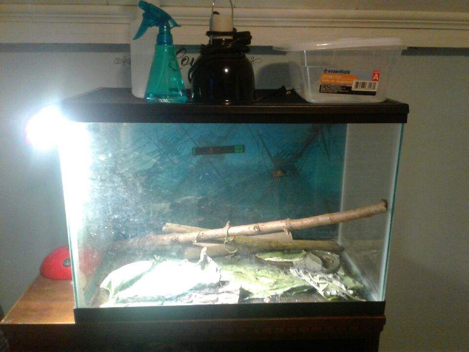 - History - Any previous information about your cham that might be useful to others when trying to help you. Before coming into my care he was kept in this tank: (see picture of the glass fish tank), his crickets where not being dusted, and he did not have any uvb that I know of. The vet did say yesterday that he didn't see signs of MBD.