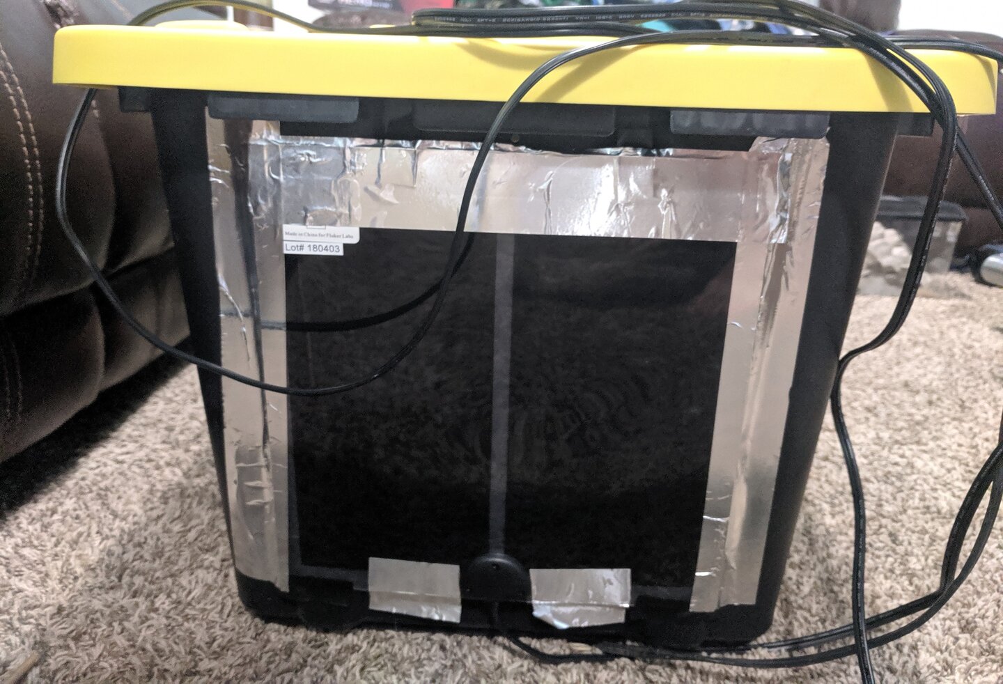 A combination electronic thermometer/hygrometer (probes inserted through a small hole drilled in lid).