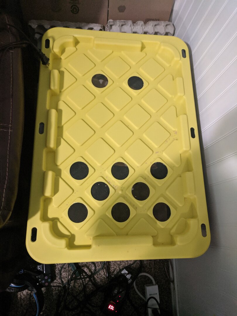A 12 gallon black tote with a yellow lid from the orange box store (with 4 2" vent holes on the sides covered by metal screen repair mesh).