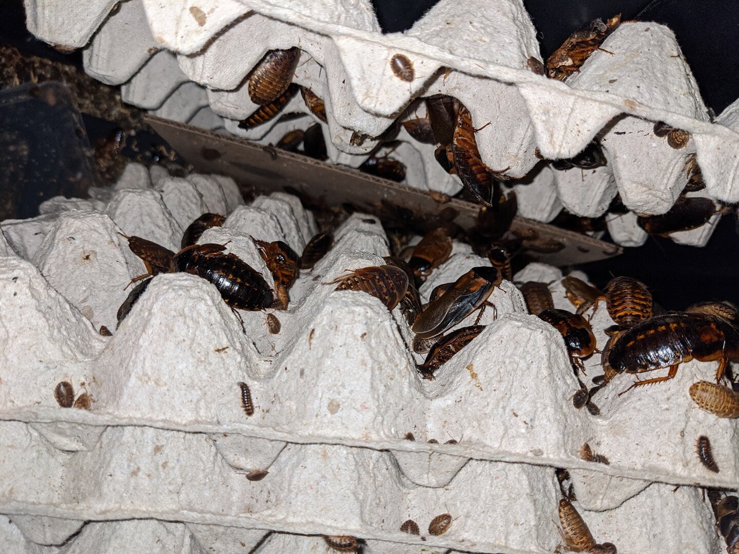 A quantity of assorted dubia roaches to establish the colony (30 or so of medium size, 5 breeding males, 20 breeding females).