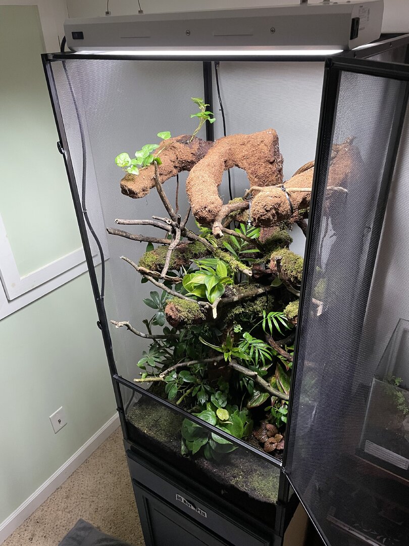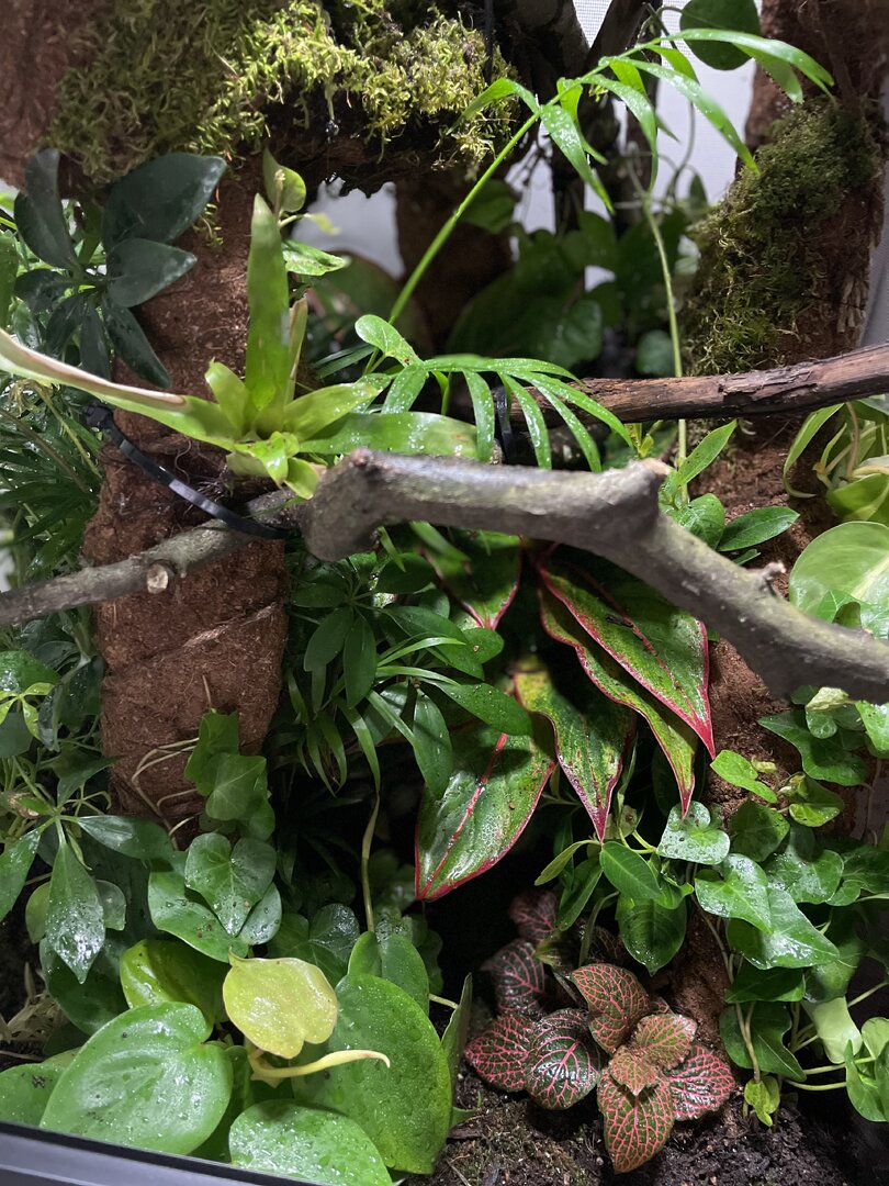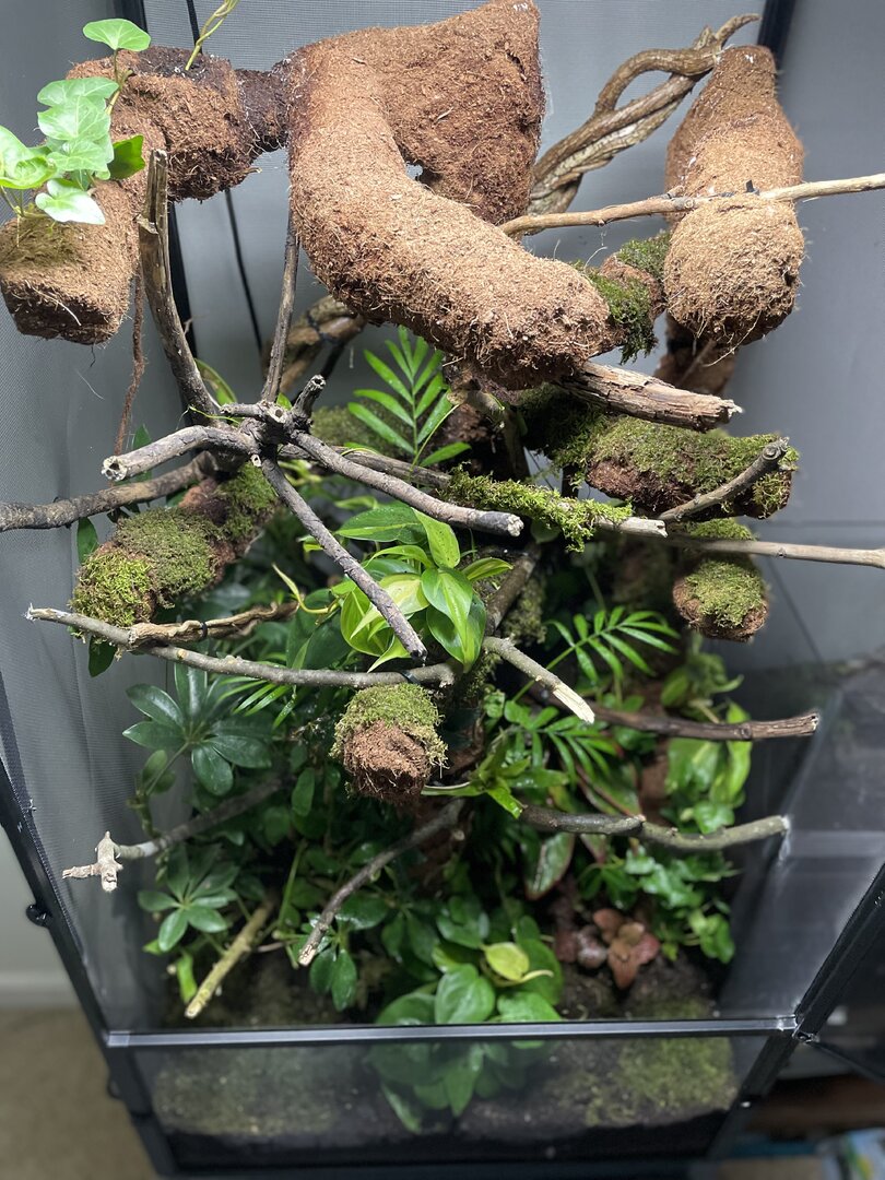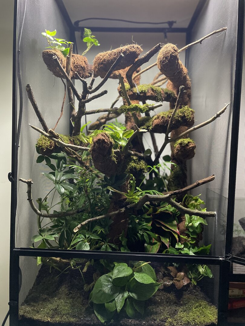 I Do not yet have the UVB and heat and a few other things but that should be arriving later next week... Anyhow what I do want to say is my parents love my passion and Don't put a budget for this project as it's doubling as a Christmas gift I'm spending roughly 400-600$ on the enclosure but I'm sure you can spend a lot less and a lot more. Now please give me constructive criticism and feedback for any little changes i should make! (The tank is bio active and i did get safe moss and plants also i built a amazing drainage system and misting system) yes i know how to take care of a chameleon so please just give me feedback on the enclosure as im waiting for my plants to grow in i also used a lot of wild vine that wrapped around each other (cleaned)