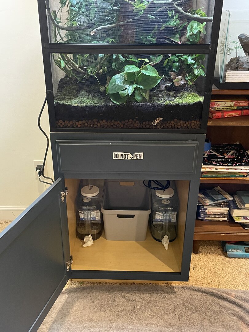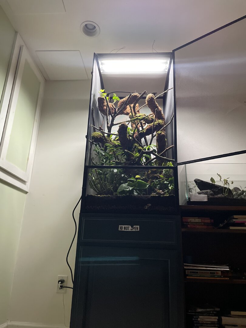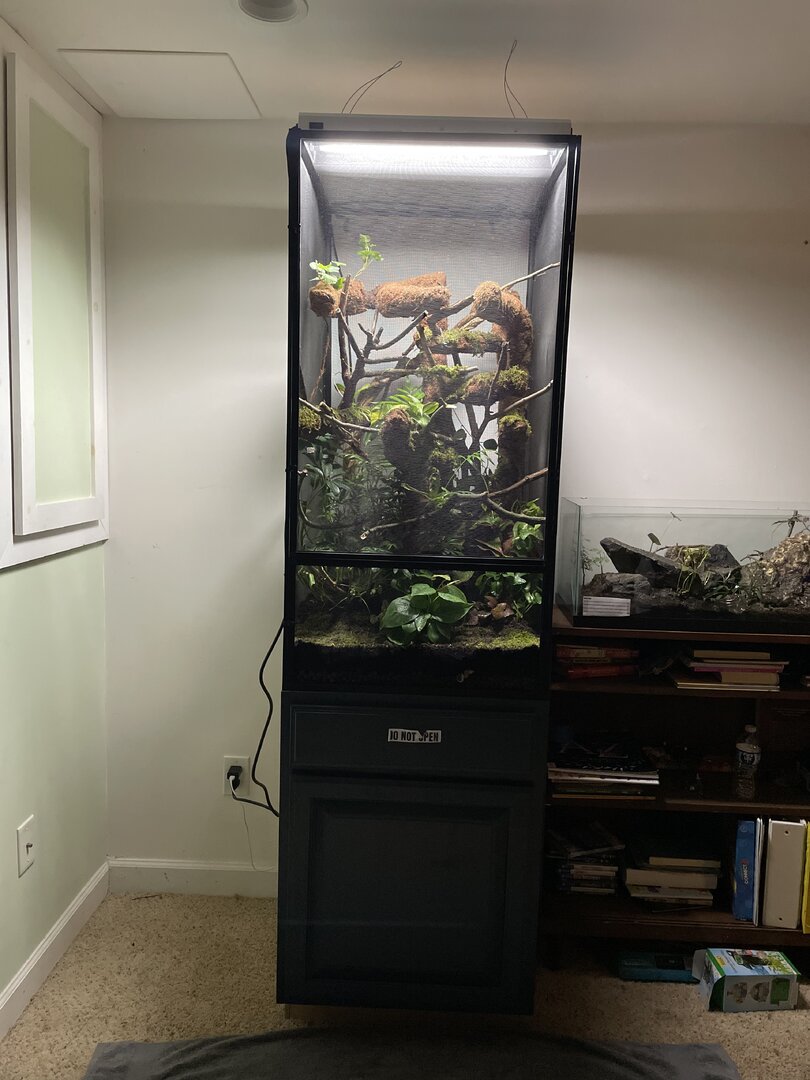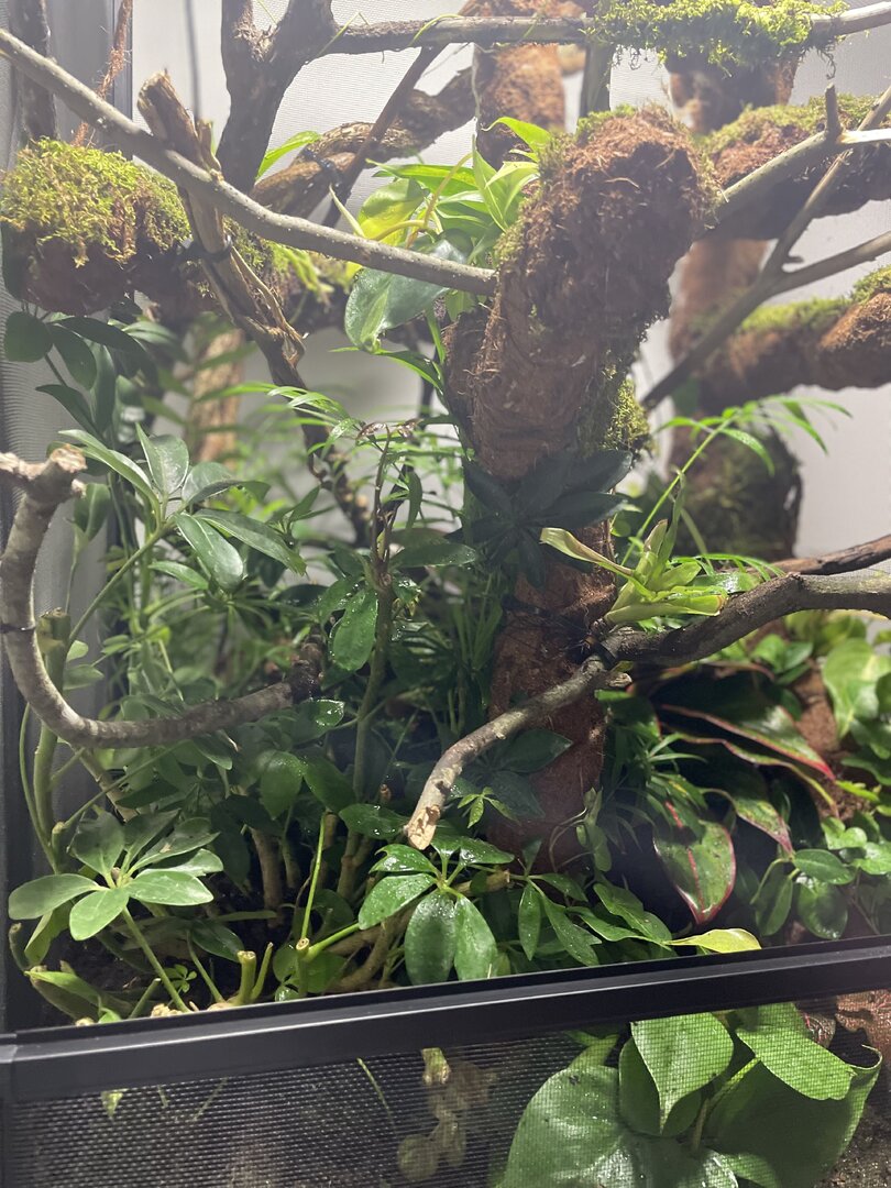 I Do not yet have the UVB and heat and a few other things but that should be arriving later next week... Anyhow what I do want to say is my parents love my passion and Don't put a budget for this project as it's doubling as a Christmas gift I'm spending roughly 400-600$ on the enclosure but I'm sure you can spend a lot less and a lot more. Now please give me constructive criticism and feedback for any little changes i should make! (The tank is bio active and i did get safe moss and plants also i built a amazing drainage system and misting system) yes i know how to take care of a chameleon so please just give me feedback on the enclosure as im waiting for my plants to grow in i also used a lot of wild vine that wrapped around each other (cleaned)