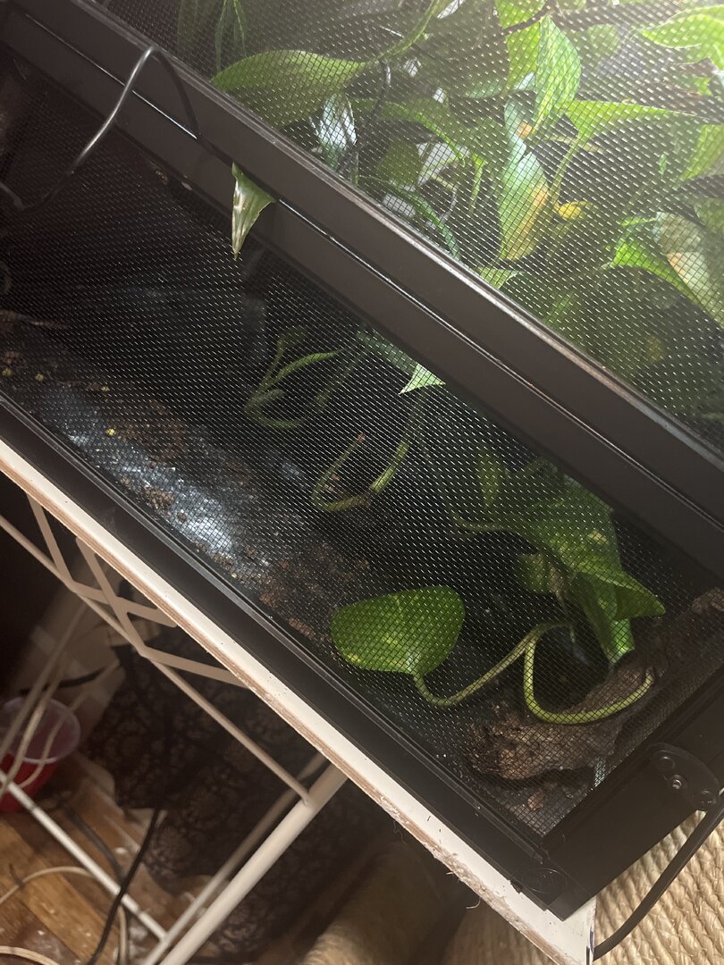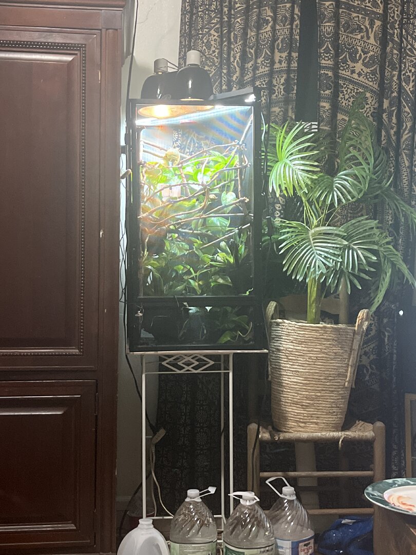 Ok She’s in a Reptibreeze vivarium completely screened size Large. I think it’s 18 x 18 x 34 or whatever i’m going to get her the 24 x 24 x 48 soon, i just want to make sure she’s out of the woods first.