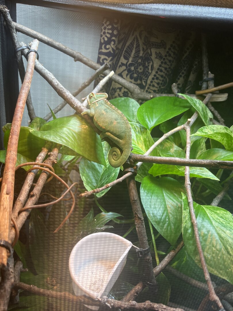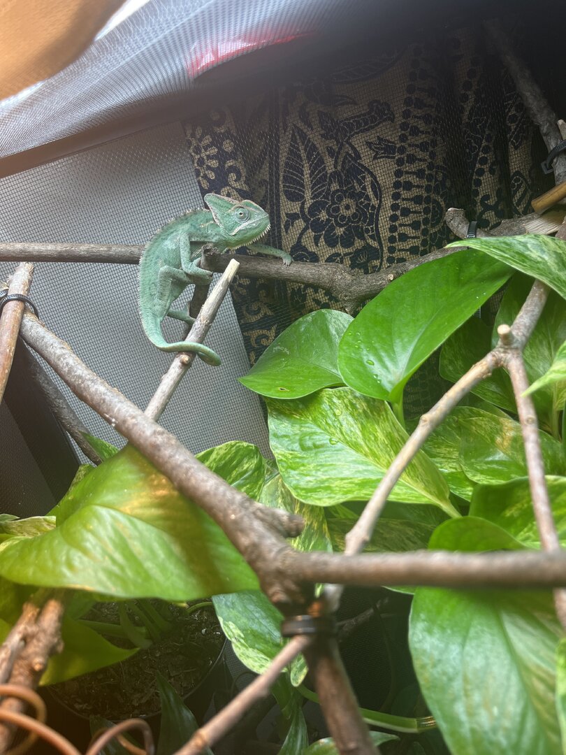 You don’t want it high, because your temps aren’t cool enough. Heat plus high humidity is a big risk factor for respiratory infection. The ideal daytime humidity for veileds is between 30-50%. Ideal daytime basking temp for our girls is no higher than 80. At night, if you are able to consistently achieve temps below at least 68, that is when it’s ok to boost humidity all the way. Not everyone can achieve that night time temp drop. I’m in Florida and it isn’t possible, so I don’t increase humidity at night. I do a drip system no more than once a day but not everyday more like every other day to see if she takes interest in it. if she does i’ll feel it up more or make sure the plants have a good amount of droplets.