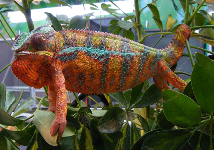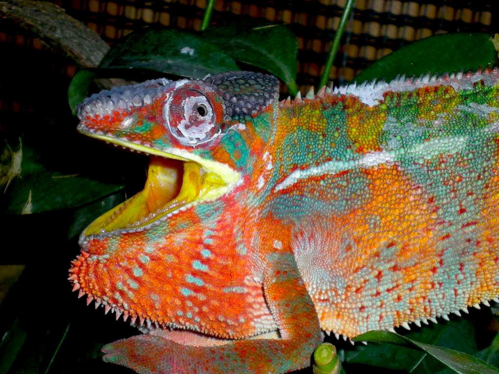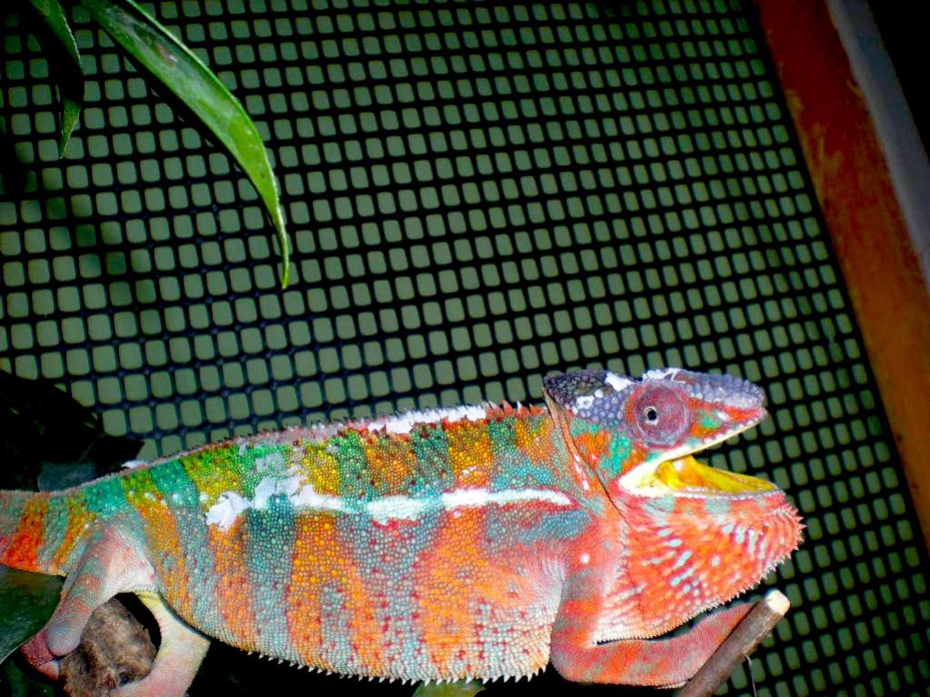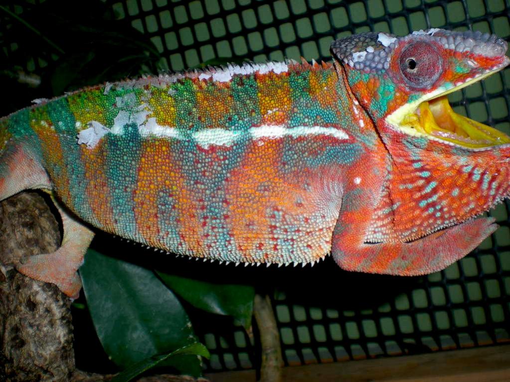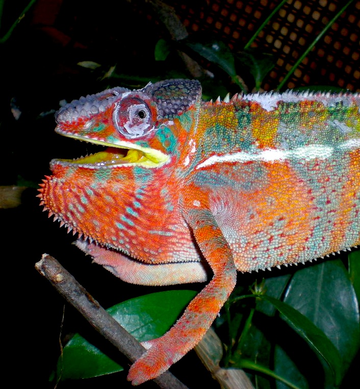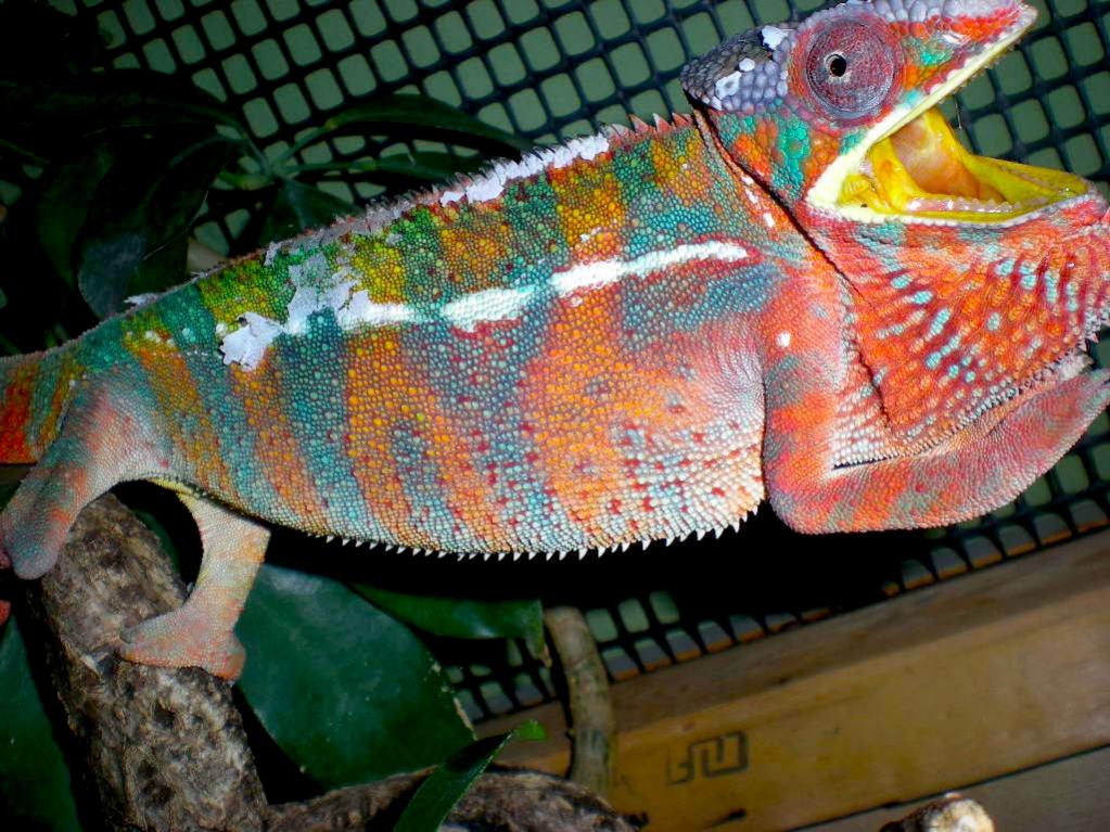 So the CH Male I got from pardalisgirl a while back decided he wanted to shed during the last couple days. He has since finished but wasn't in the mood to pose today or yesterday. Here are a few shots of him in mid-shed. He was already really agitated because of the shed on his eye and his fiery burning hatred for the camera shows. In these pics however he isn't showing fired up colors. These are kinda between rest and fired up. When he's fully fired he goes completely red/orange with very thin teal lines that almost disappear. Hope you like him.