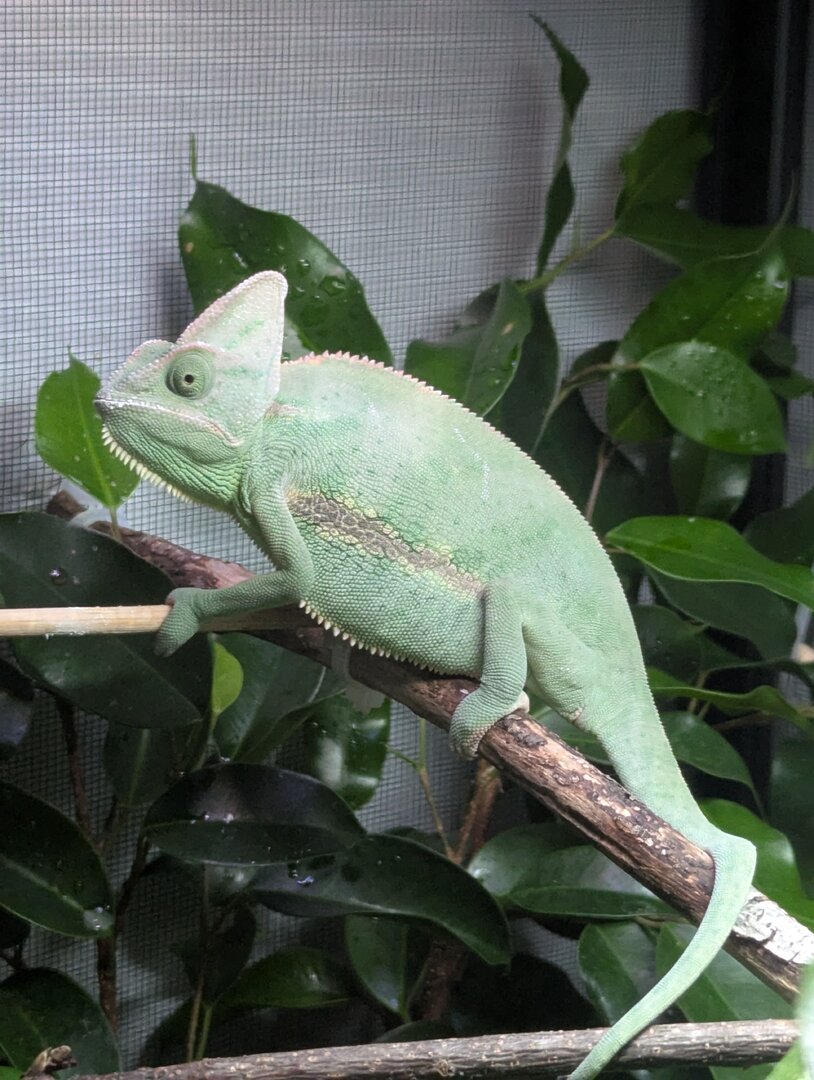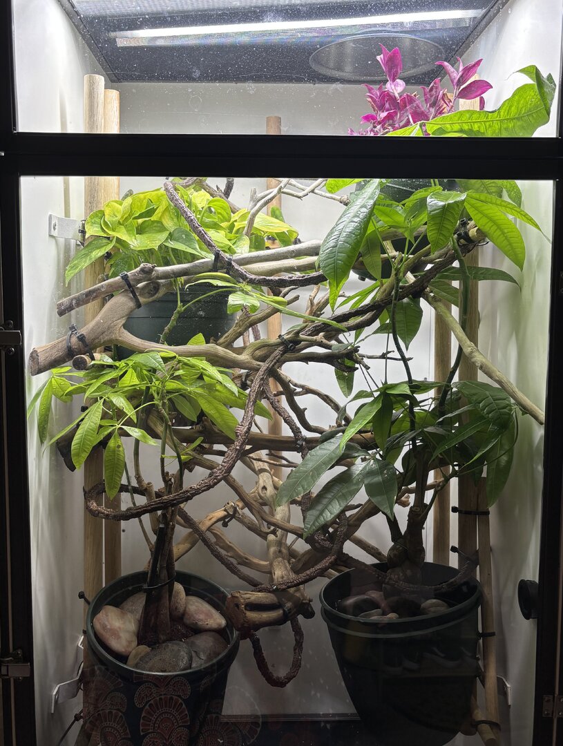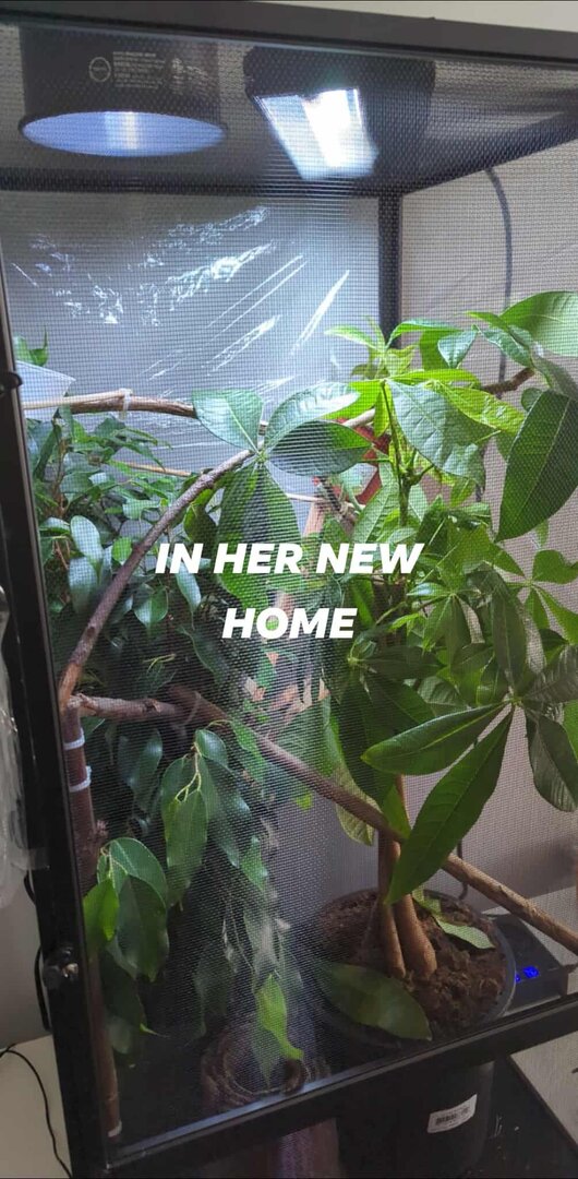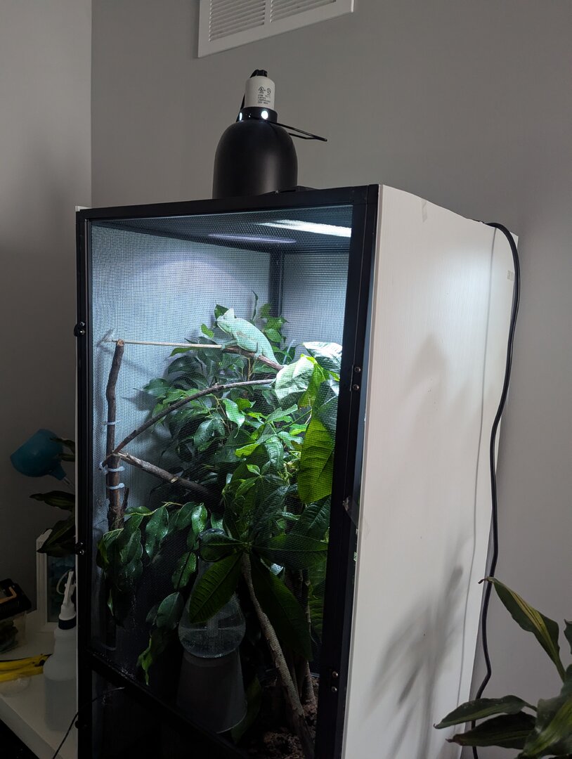 Just upgraded my girl into her forever home as she was in a hybrid cage before but was on the smaller side, she has outgrown that and now she's in a much taller cage, is my husbandry correct? I have a linear T5 lamp, basking lamp that's 10" from the bulb to her basking branch, she has a fog machine at the bottom of her enclosure which is only ran overnight for a few hours, currently the daytime humidity is sitting at 30%, but what I will have difficulties with is the overnight humidity which I started wrapping but got frustrated with the wrap so I'm looking for an alternative to keep those nighttime humidity levels where they should be. Thank you for your input.