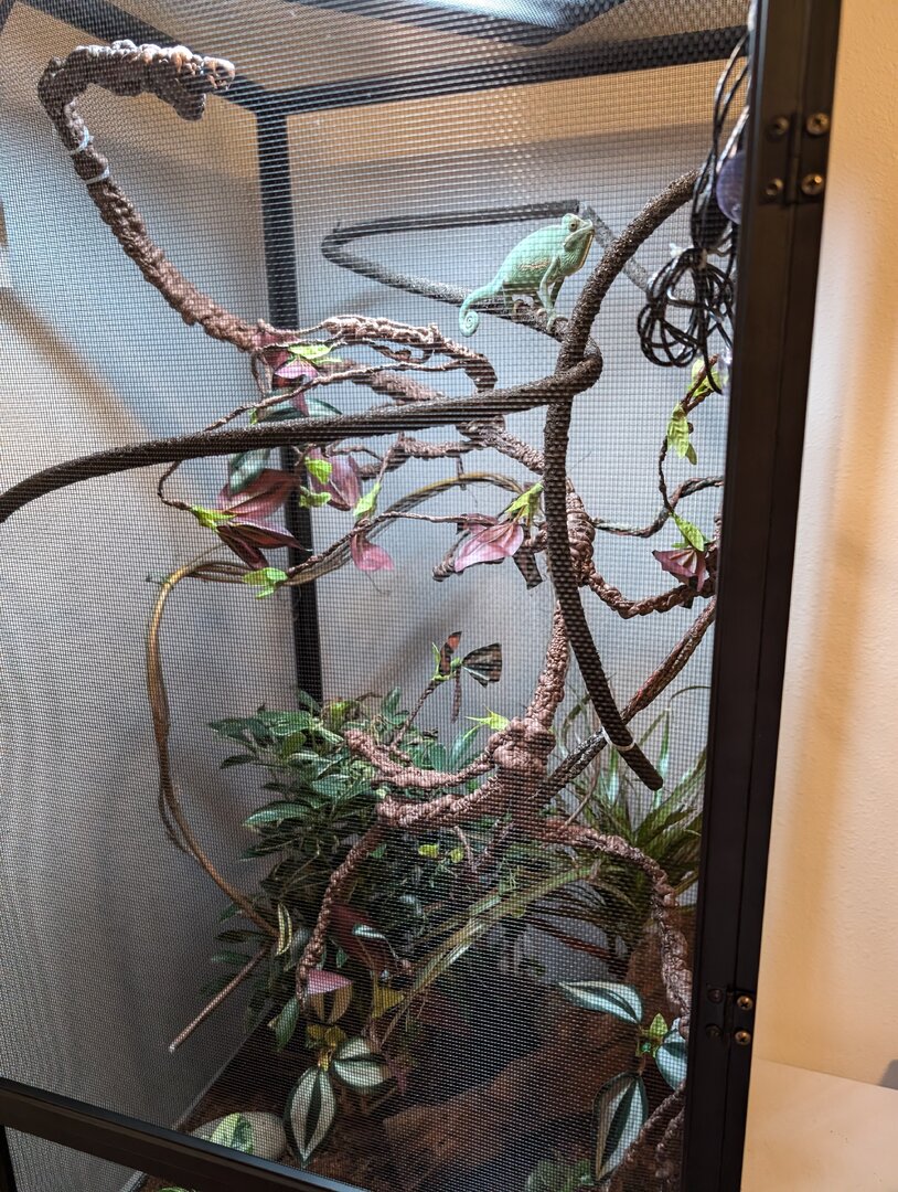 - I would put some more plants for coverage, maybe a monstera on the bottom and a pothos somewhere on top, but any chameleon-safe plants will do. (real plants are always better)