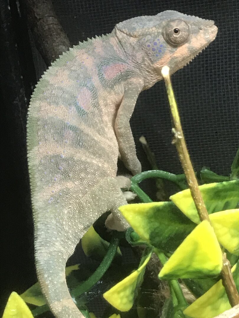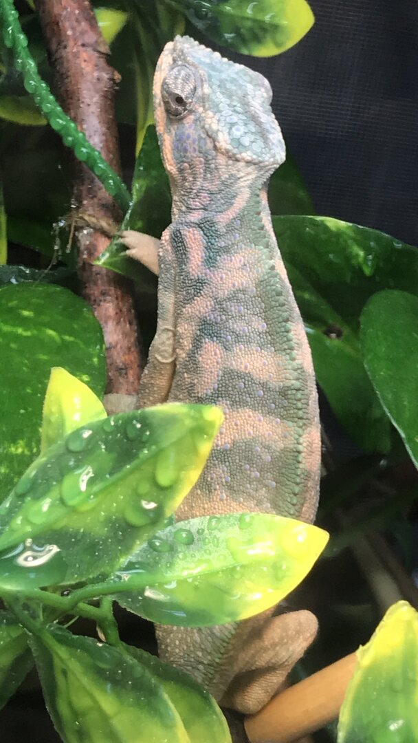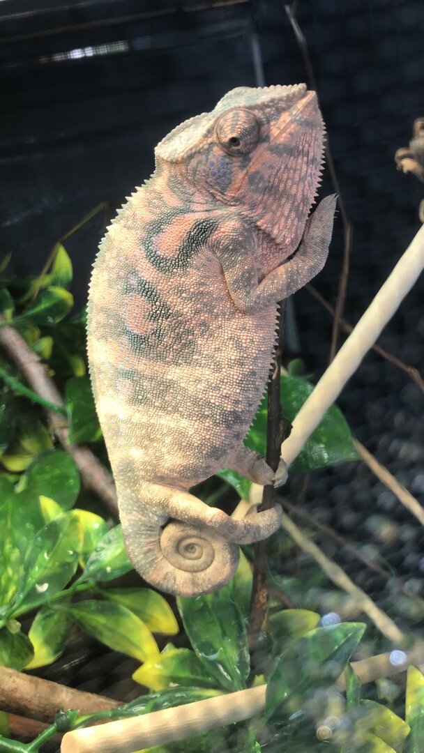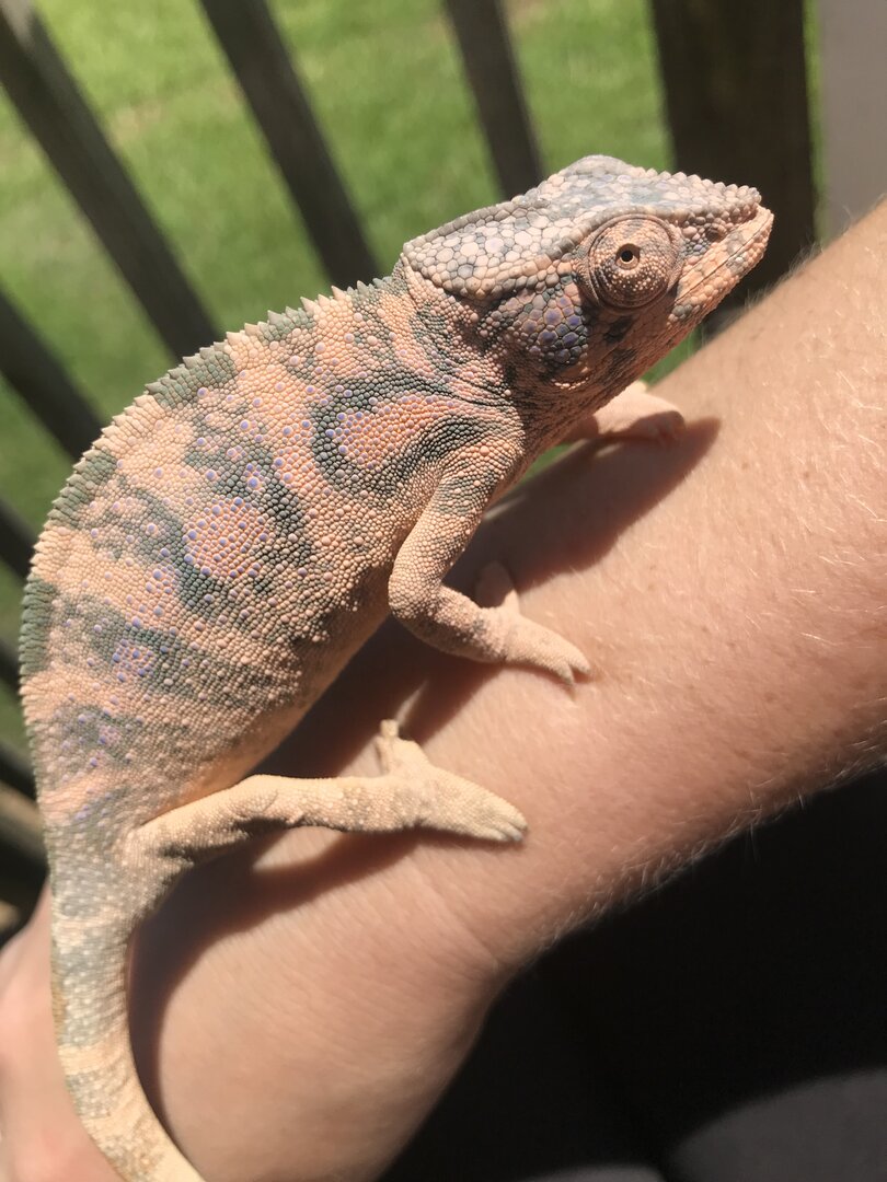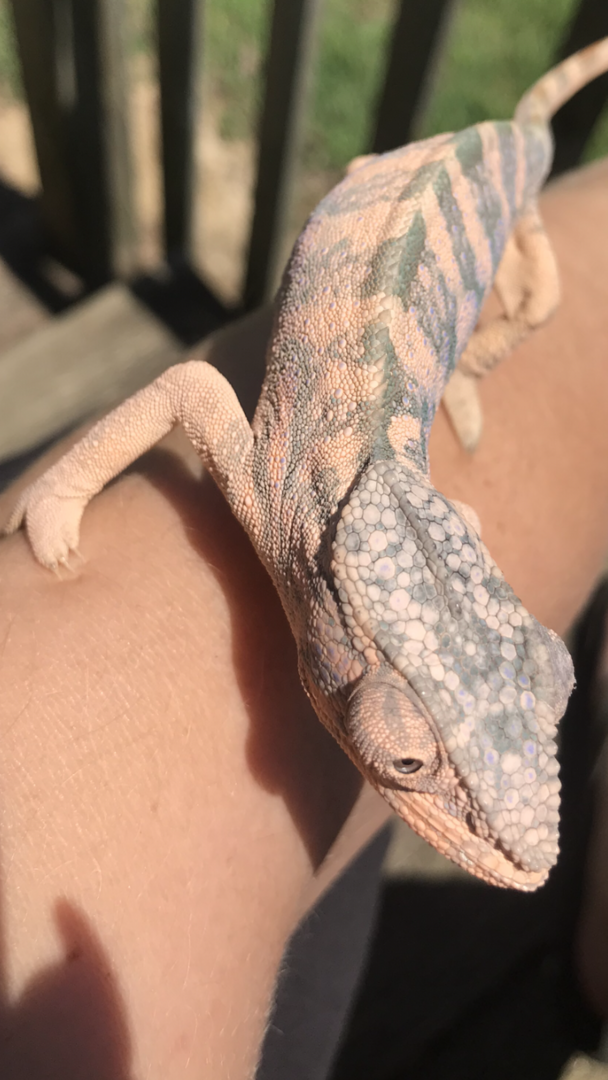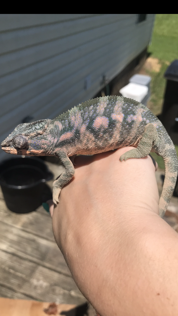 Took my girl out for about 20 mins of some sun today. Soooo, I like to go on a Facebook chameleon page and just show off my chameleons, I will not date ask them any questions bc they can be hateful and very mean. I come here for all my questions bc any answer I have ever received has been kind, constructive, and very helpful. If someone doesn’t quite know the answer they tag someone that they know does know the answer. So I posted these photos of my lovely Remy on the FB page & someone said she was gravid. Now, i am currently going through the receptive stage of a Veiled cham and they are completely different looking when receptive. I have a photo of Panther Chams that show the receptive-gravid stages and I didn’t think she had ever shown receptive coloring... she is 8 months old, she doesn’t appear to be gravid in my opinion... these are normally her ‘not sure about what’s happening colors’ when I take her outside (normally only for 20 mins & I only hold her about 2x per month unless it is to get her from one cage to the other for cleaning)
