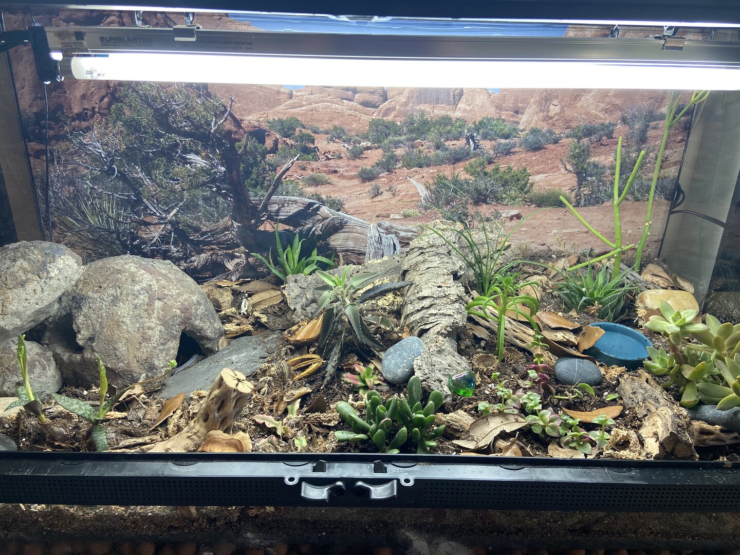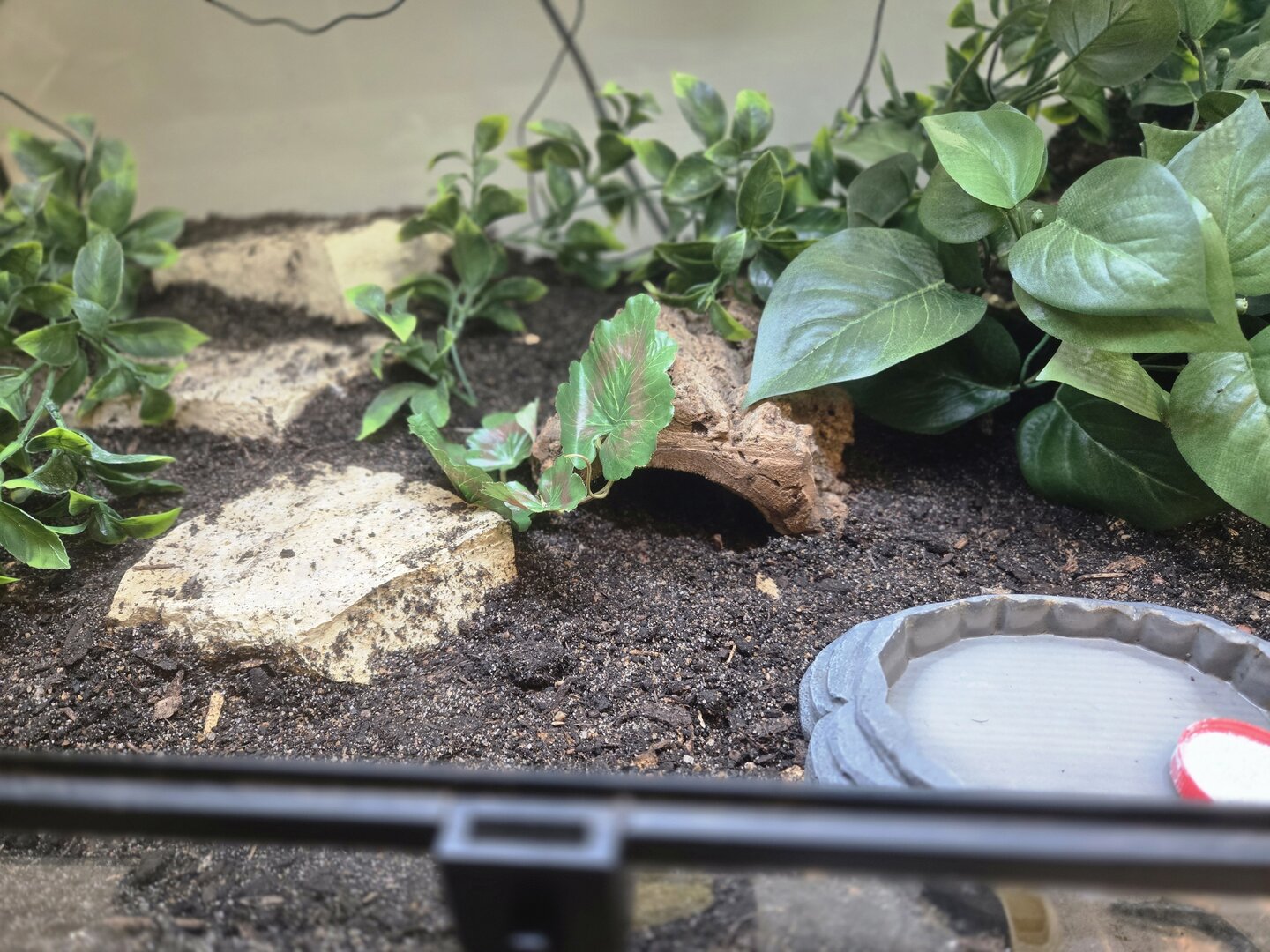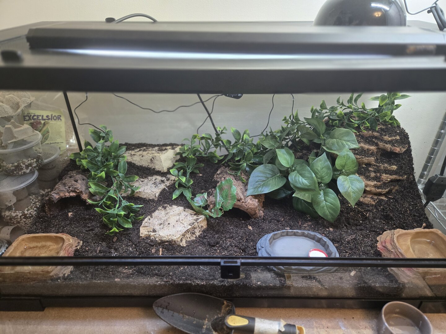 She brought the baby in a 10 gallon aquarium with a screen lid, a water dish, and half logs for hides. As this was entirely unexpected on my part, I don't have much else to set this baby up with on hand.