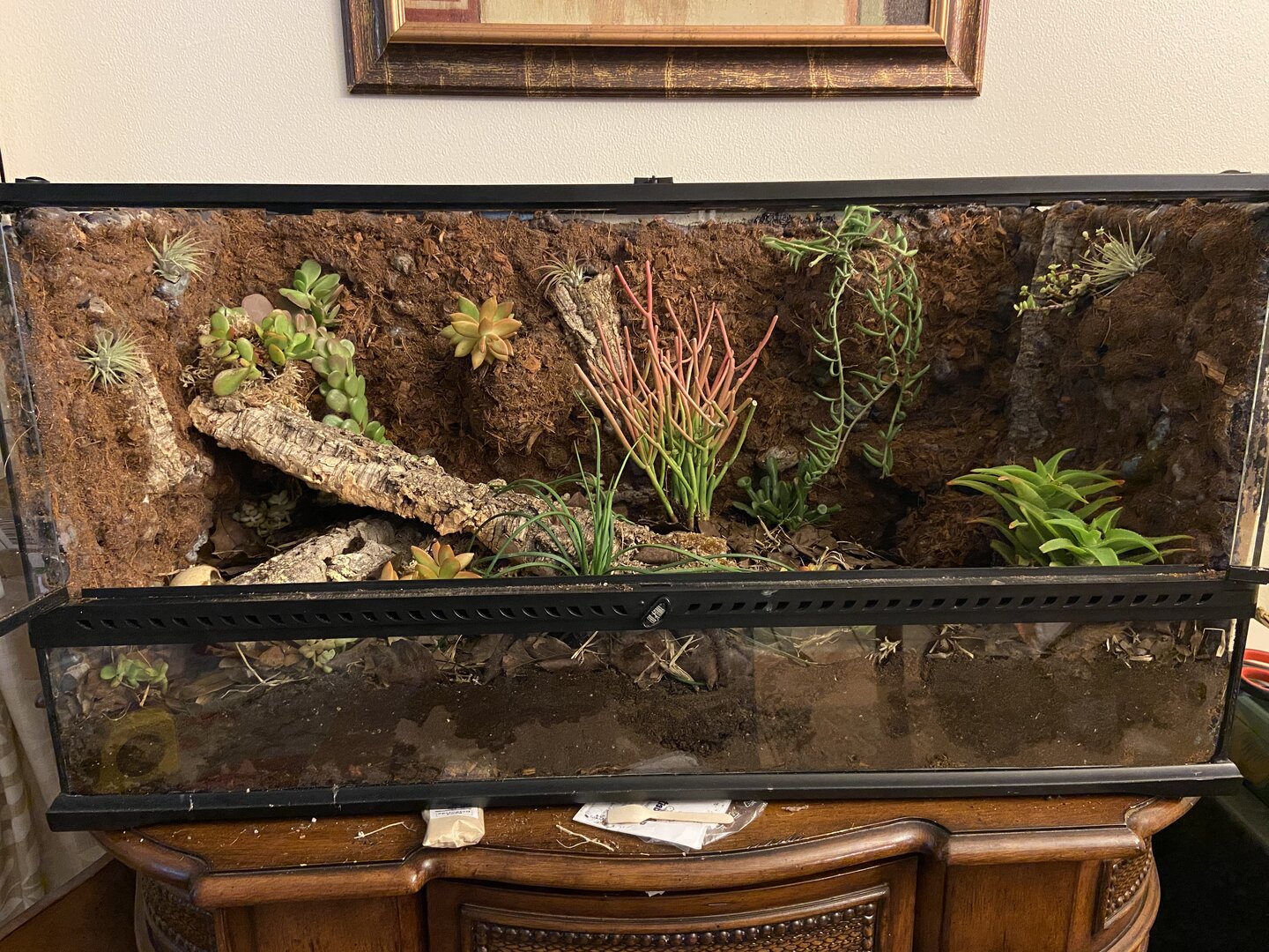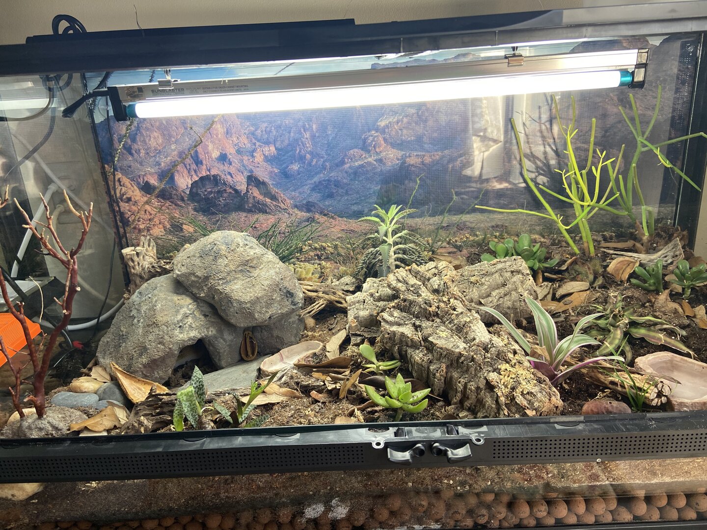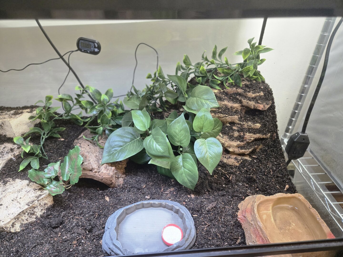 She brought the baby in a 10 gallon aquarium with a screen lid, a water dish, and half logs for hides. As this was entirely unexpected on my part, I don't have much else to set this baby up with on hand.