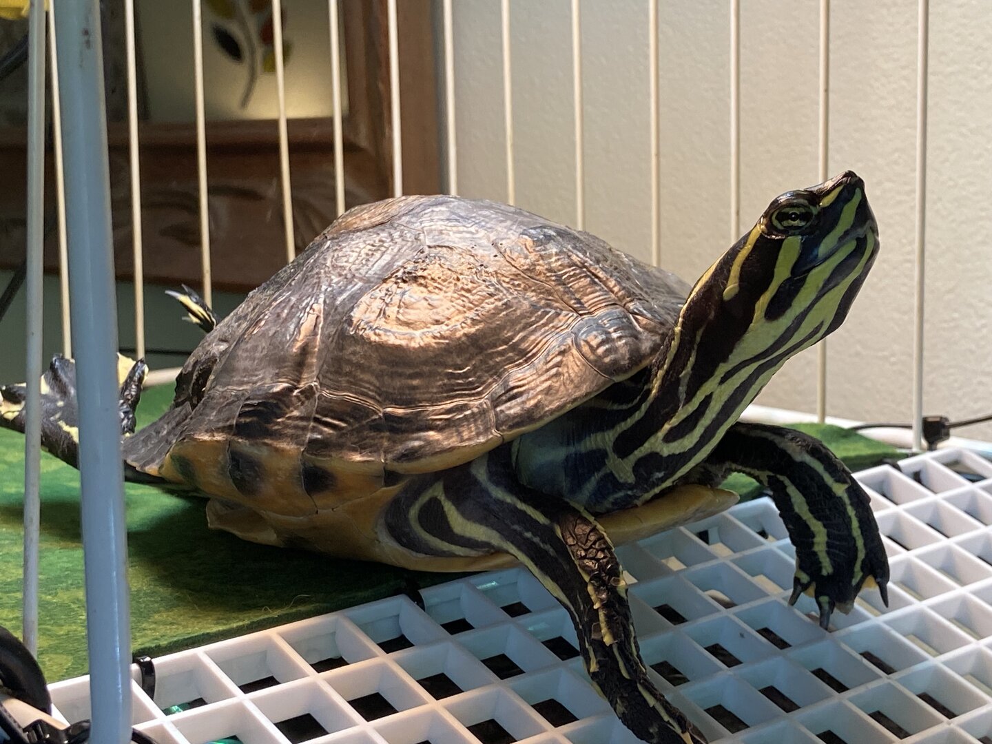 He is such a cutie!Update: turtle is doing so much better. He’s stopped shedding scutes finally and his shell is looking better. He loves to eat and has learned quickly how to tell me he wants food. Still not taking more than a tiny nibble of greens though. I’m thinking about getting some live plants that are edible for him and see if instinct kicks in. He’s still working on his swimming and is slowly figuring out diving. For the most part though he just floats/swims at the top. His super duper filter is set up and it has a pretty strong waterfall/spray to it. He seems to enjoy playing in it a little bit.