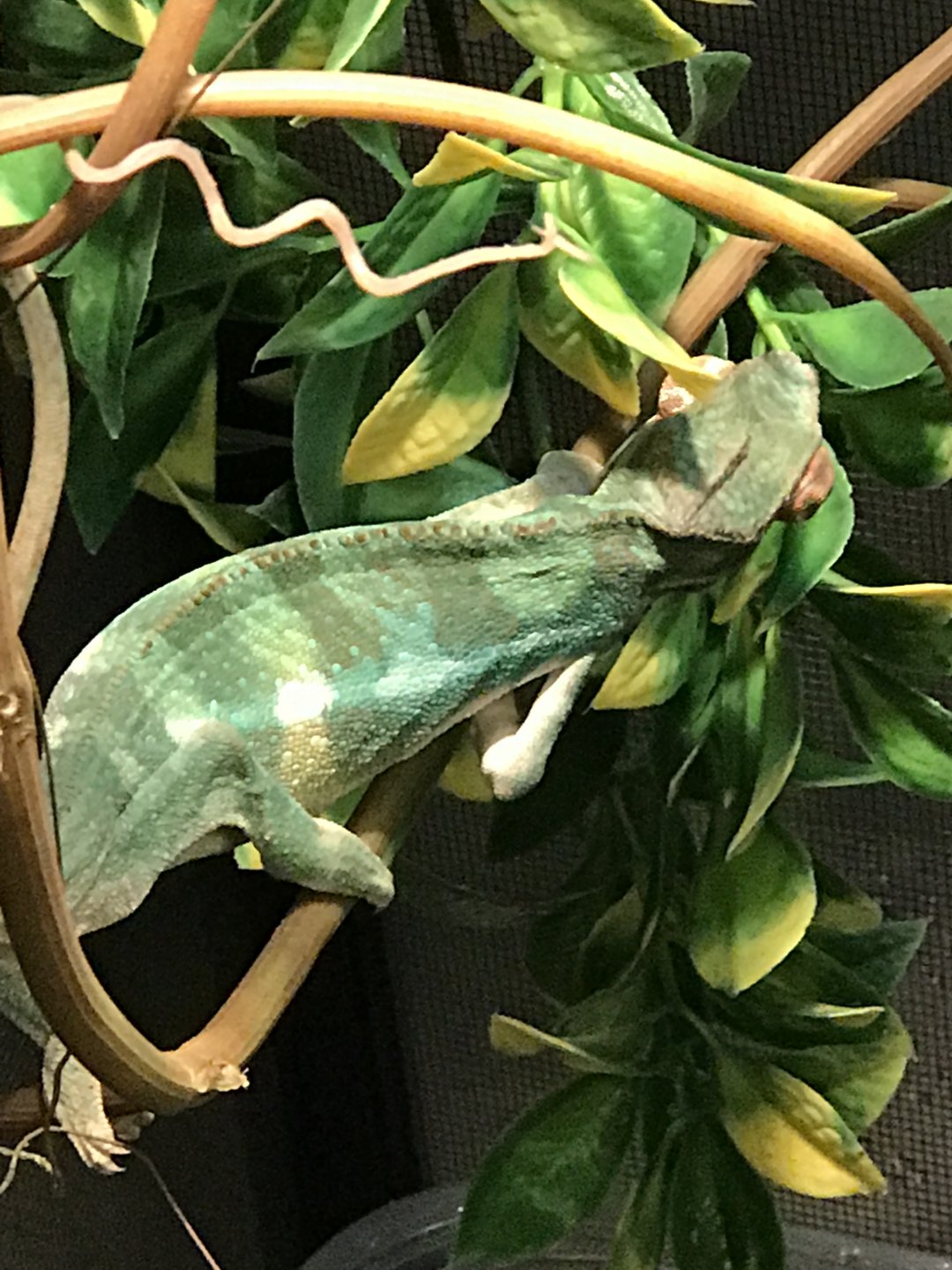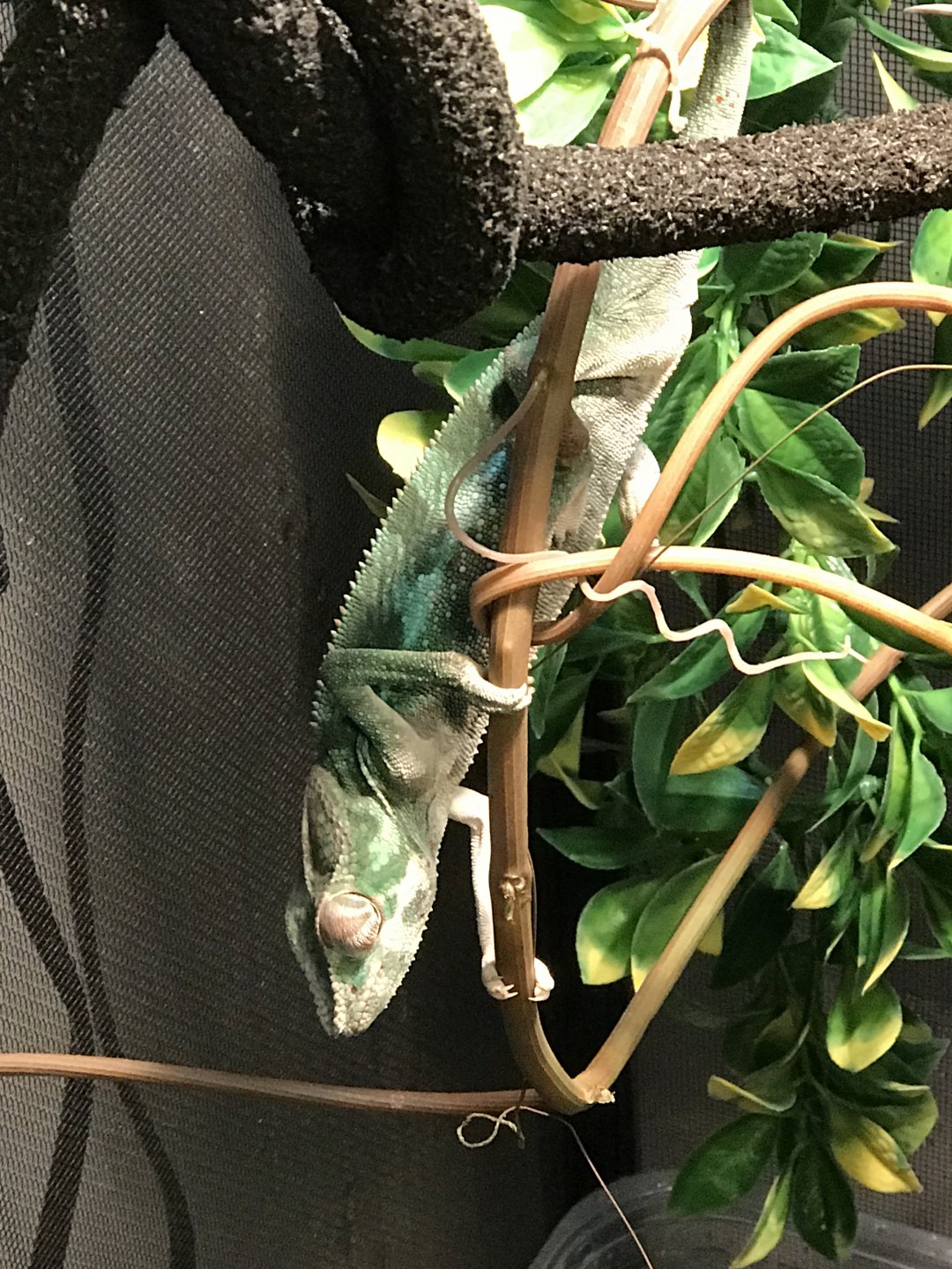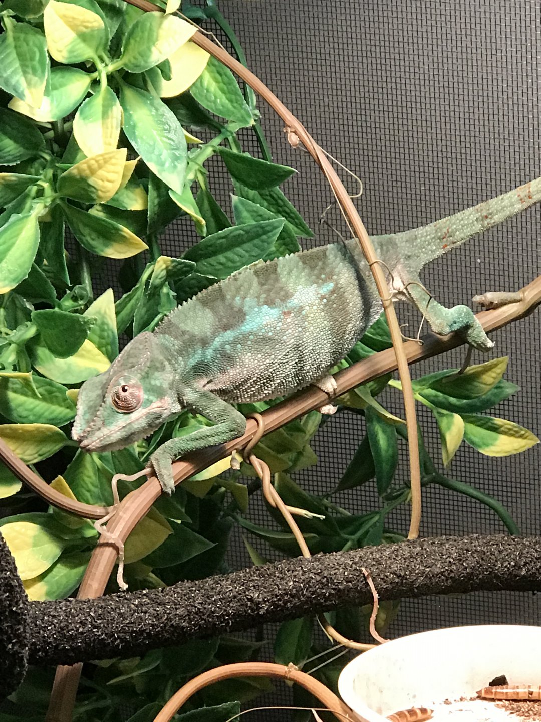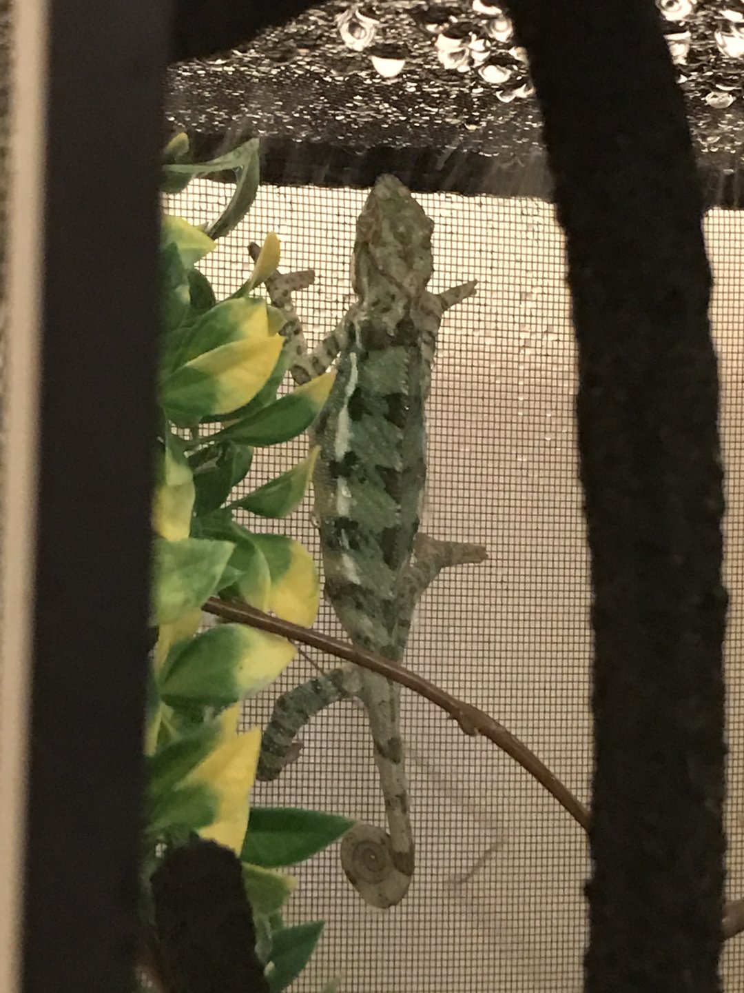 The problem: This poor little guy appears to be much smaller than other chams his age, and isn't showing the colors that he probably should be by now. He appears to be fairly dehydrated and malnourished. I fear that his growth may have been stunted by improper care. His body is around 5-6 inches and so is his tail. I know all chams are different and size/color can be individually determined, but I fear that his care was the culprit here.