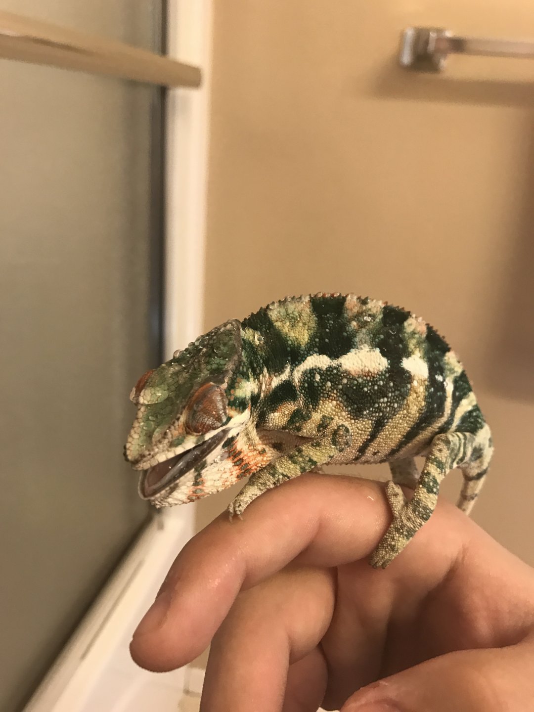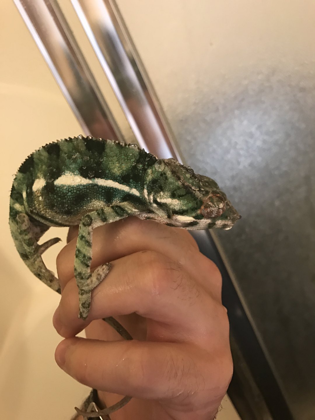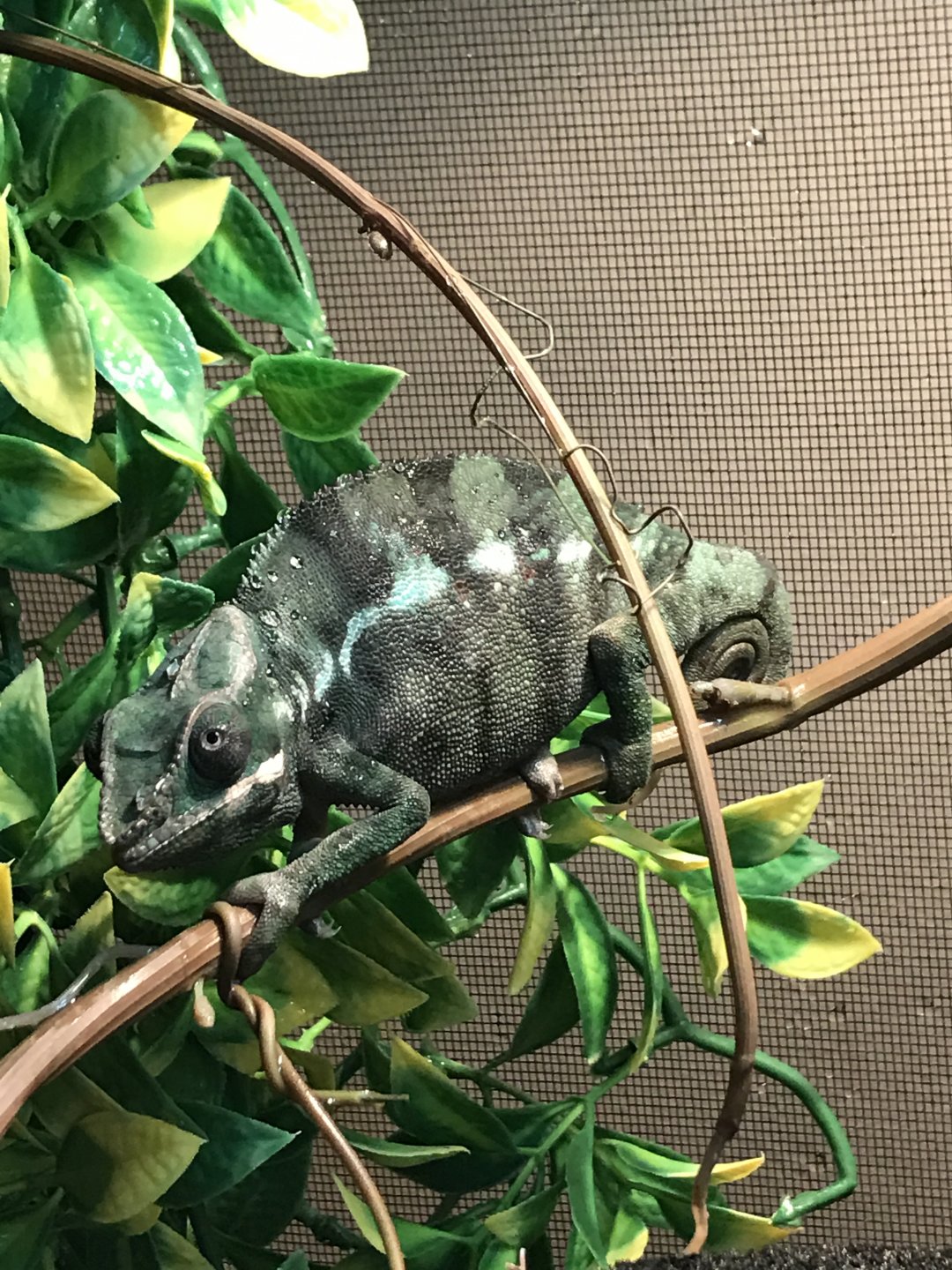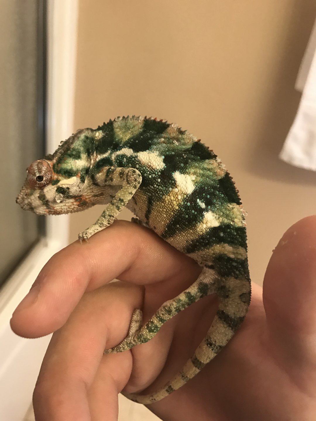 History: *The previous owner told me that he has had him since sept. of last year, and just doesn't have time for him anymore. To me, it looks like he hasn't for a while. He admitted that sometimes they forget to mist the cage for days, and have forgotten from time to time to turn the poor guys lights on in the morning. This and poor feeding habits, and the list goes on. We are probably looking at a picture of general/overall neglect here. The poor little guy is pretty skinny and looks much smaller than the other panthers that I have seen online around his age. He looks about half the size. His colors are nowhere near as vivid as others his age, however he is a pretty little guy. He has a lot of blues and greens, and is showing some yellow, red, and orange.*