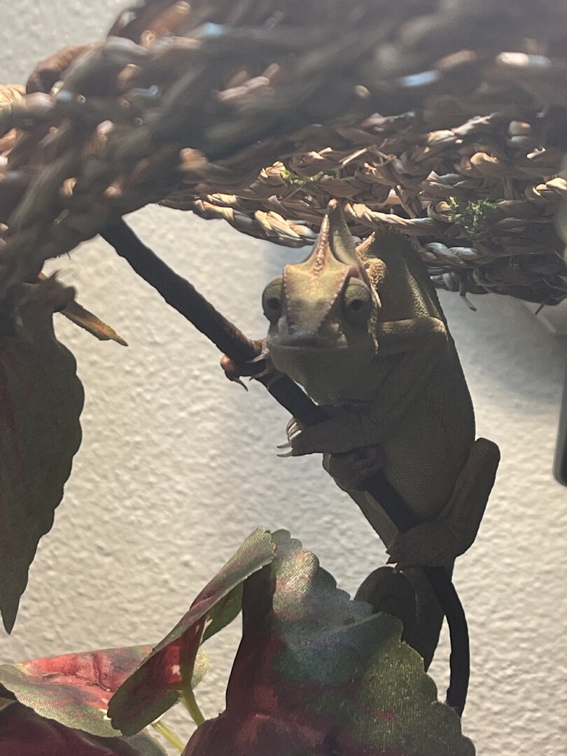 Tina is a female veiled chameleon and her age is unknown. I rescued her back in 2020 when I saw a posting on OfferUp of a you college student selling her simply because he didn’t want her anymore, I have only had Tree Frogs but once I saw her I knew I had to make sure she had a good home. I immediately went and did as much research as possible and spent hundreds on a new cage plants calcium, drippers just about everything you could think of. The day I got her she was so frightened and was always a dark dark color and clinging to the top of her extremely crowded and dirty(even mold growing all over everything inside)cage which was wayyyy to small