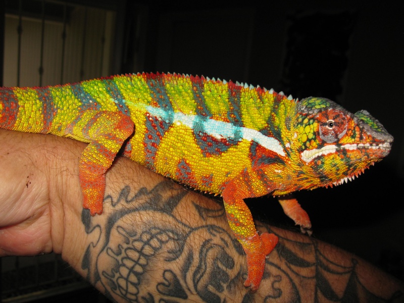 Dan I'm telling you he just doesn't fire up yet lol..my 2 male veileds kinda hate him:mad:, they fire up and he'll look at them and it seems like he's saying :cool:"huh ok"its kinda funny. The female veiled doesn't mind him:rolleyes: But he gets bright and pretty alot but doesn't get angry at all at anything:D lol..maybe a lovely lady would get him excited;)